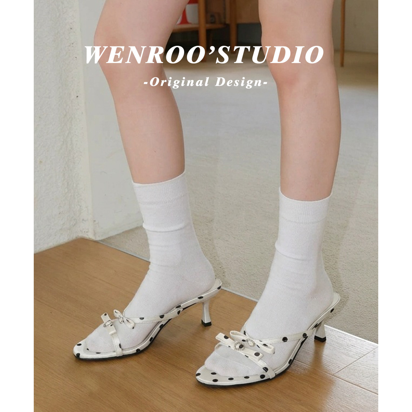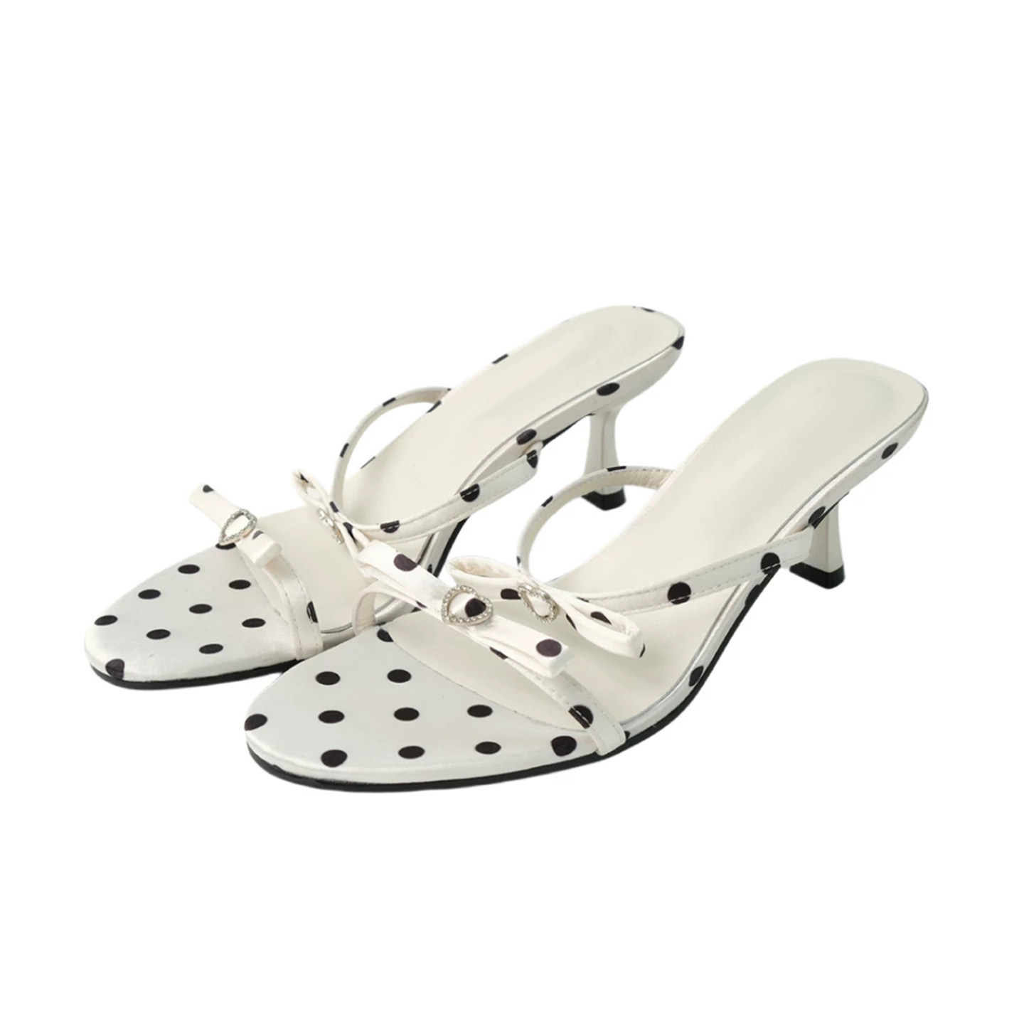 法式波点蝴蝶结细跟高跟鞋女2026夏季新款白色圆头一字带凉拖外穿