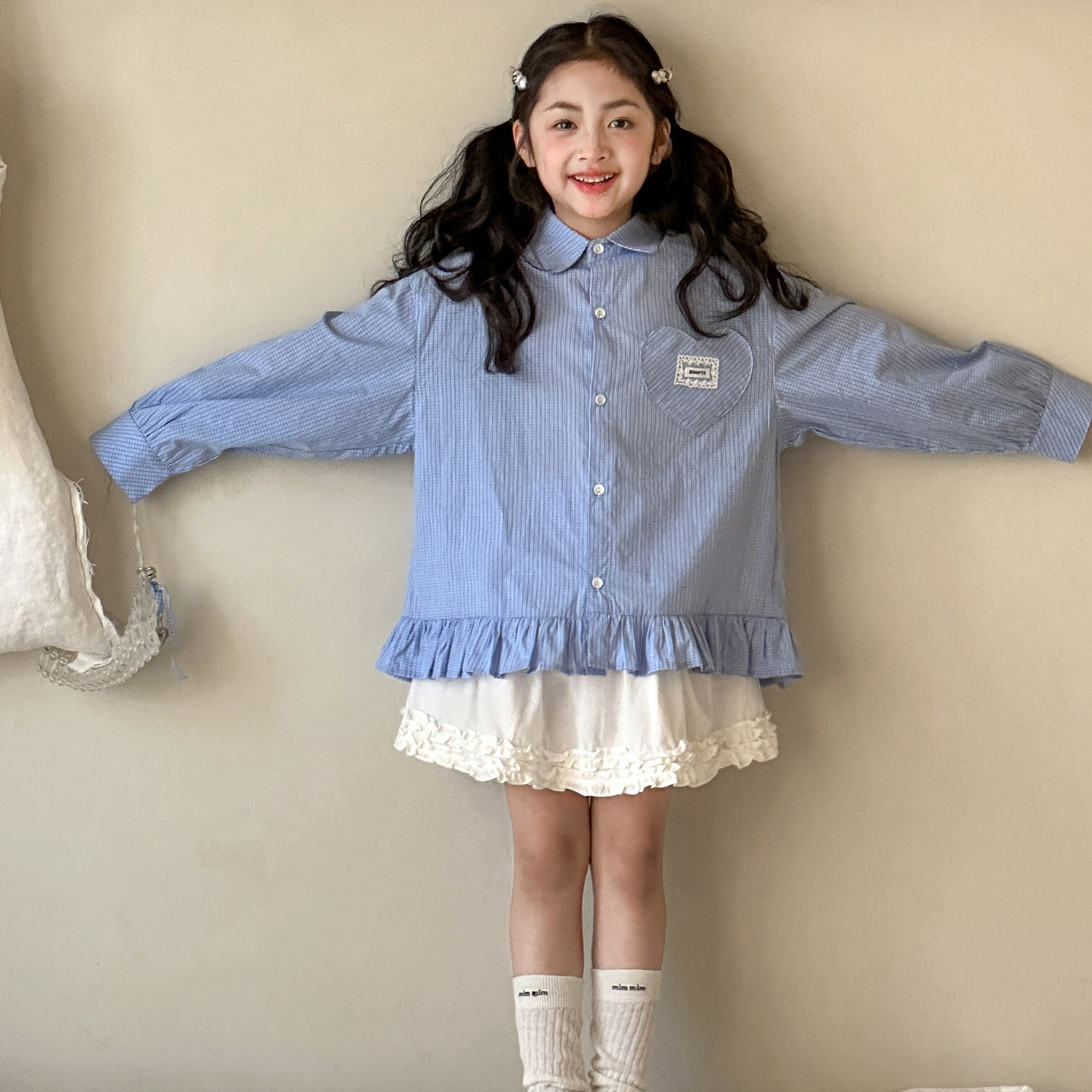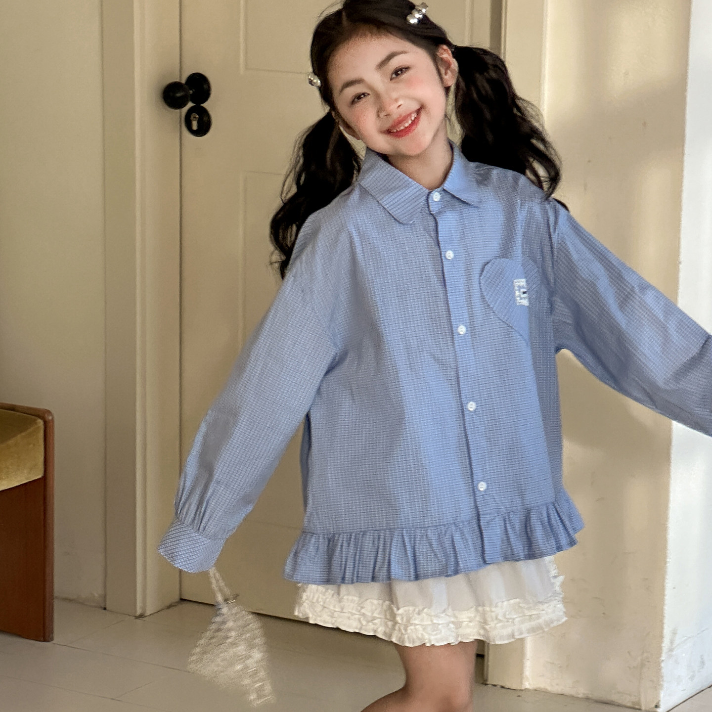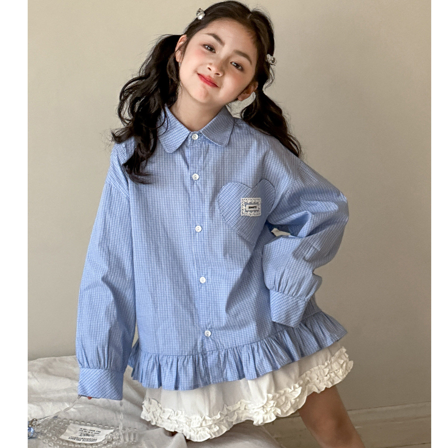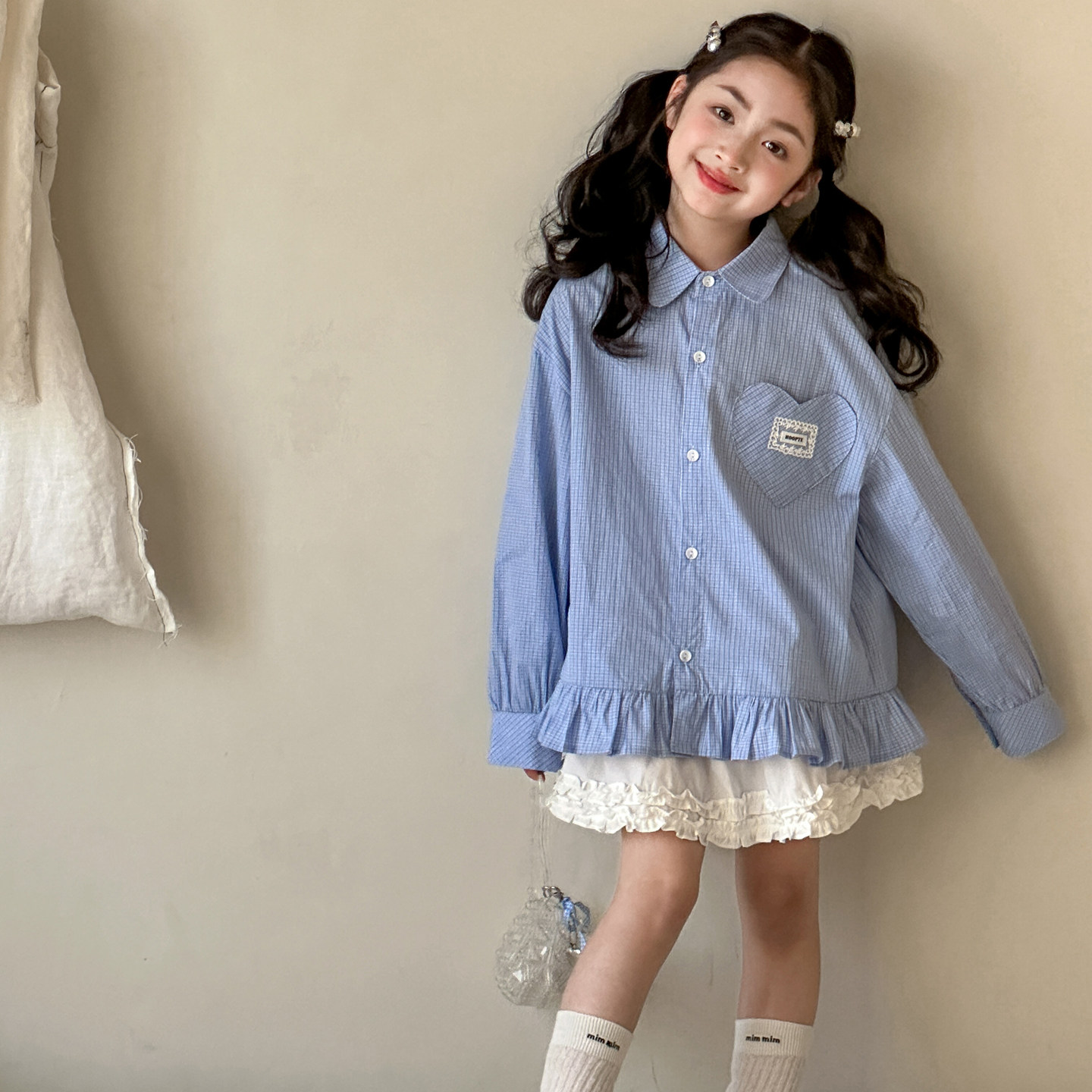 女童长袖衬衫春装2026新款初中生早春穿搭格子上衣女大童春季衬衣