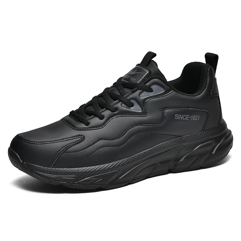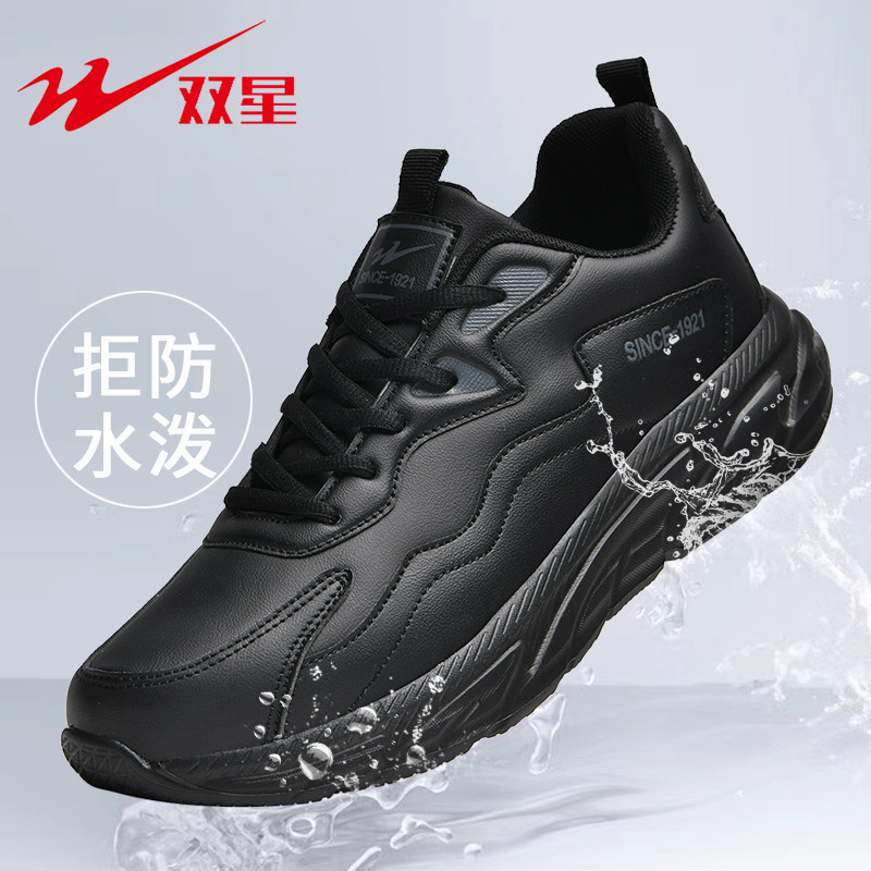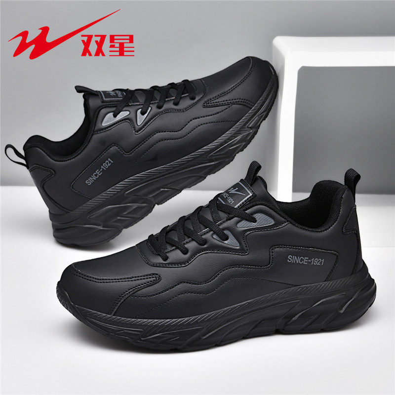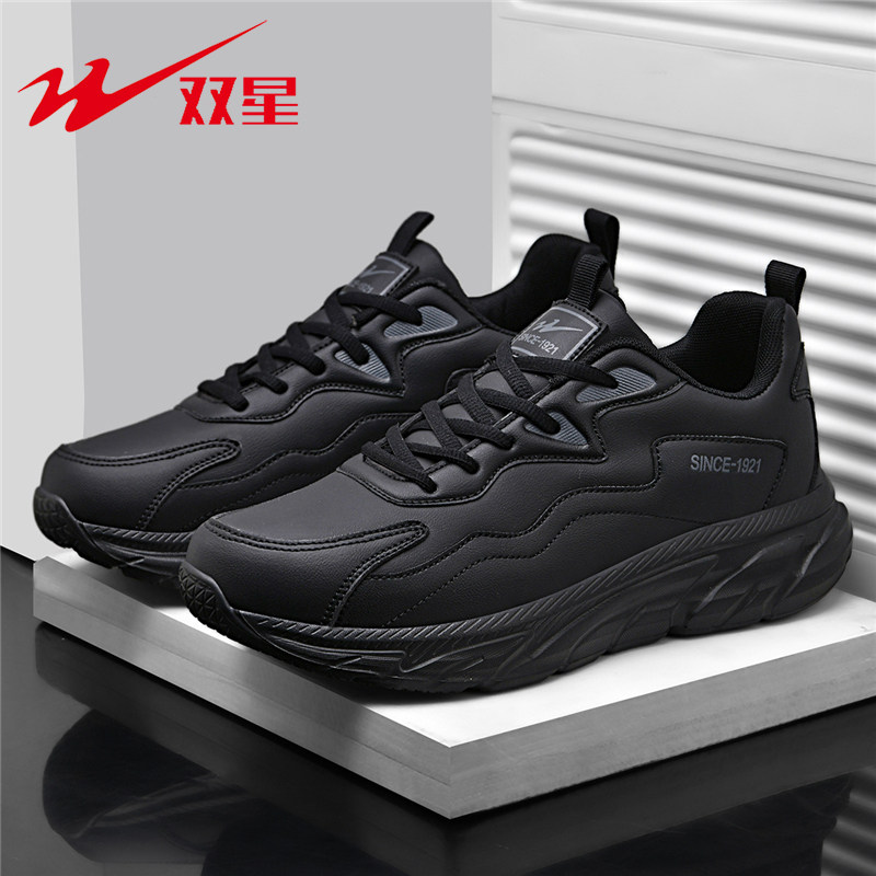双星大码男鞋春秋款皮面防水运动鞋男款防滑耐磨黑色跑步鞋男透气
