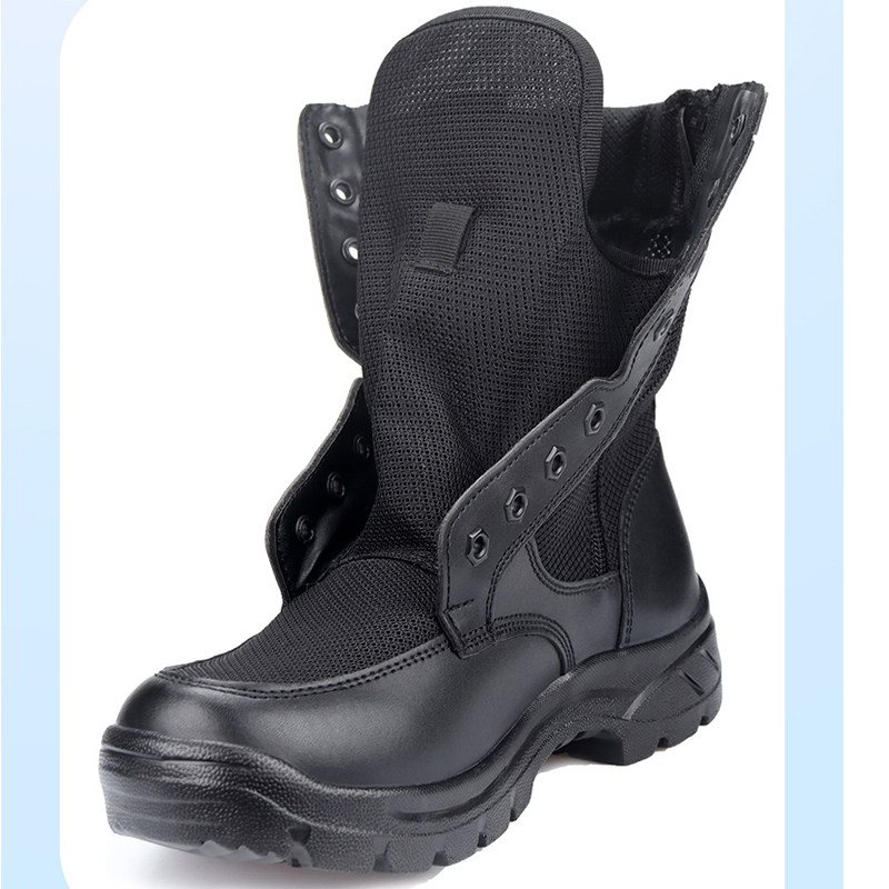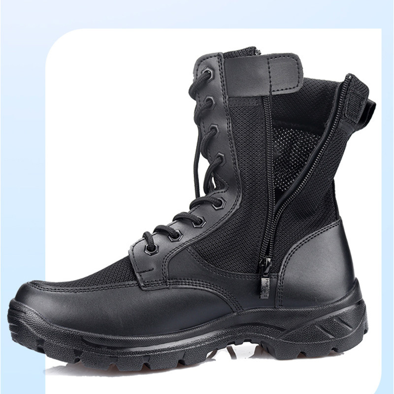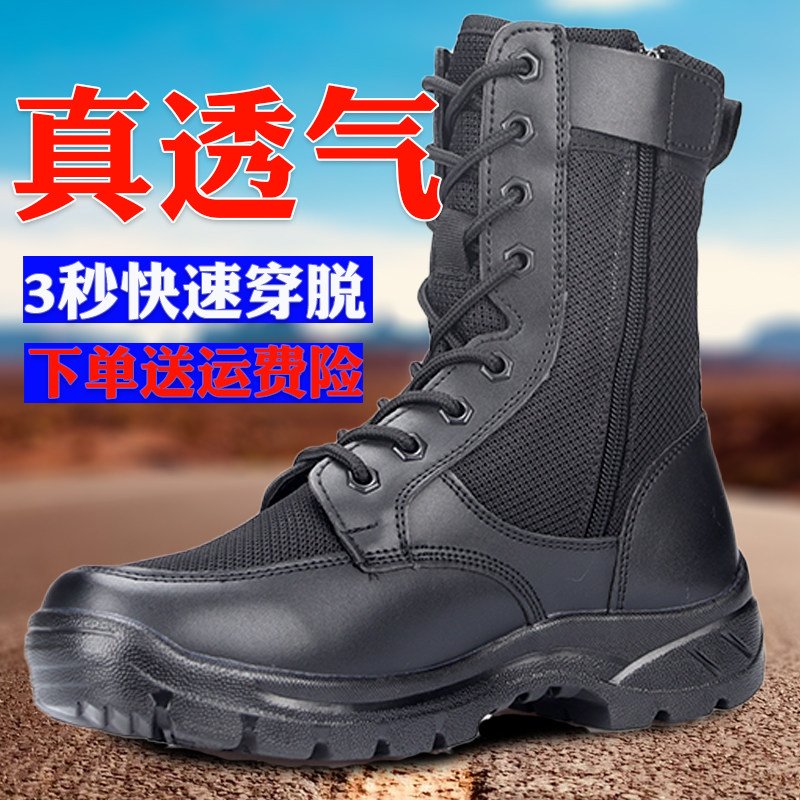 作战靴男款夏季超轻高帮安保鞋透气安检鞋黑色网面拉链军训战训靴