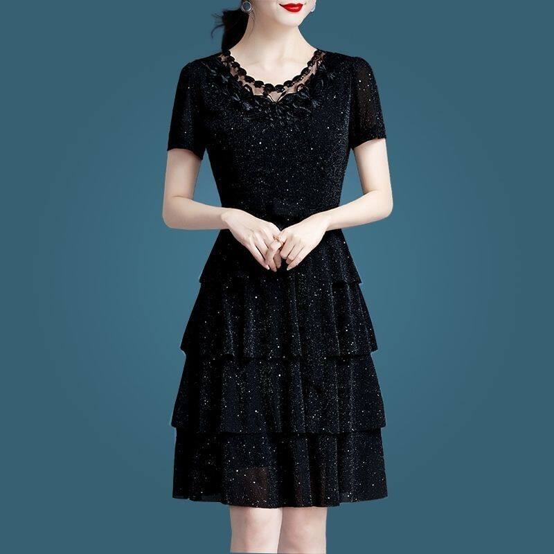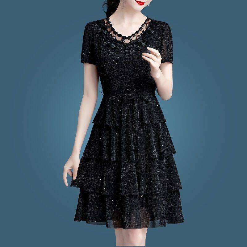 大码女装夏季网纱短袖胖mm遮肚子中长款显瘦连衣裙圆领百搭蛋糕裙