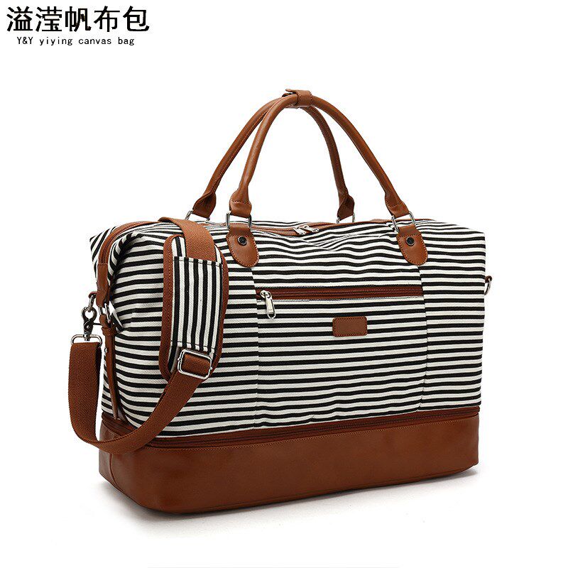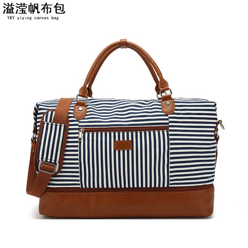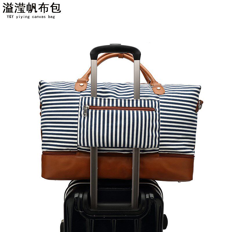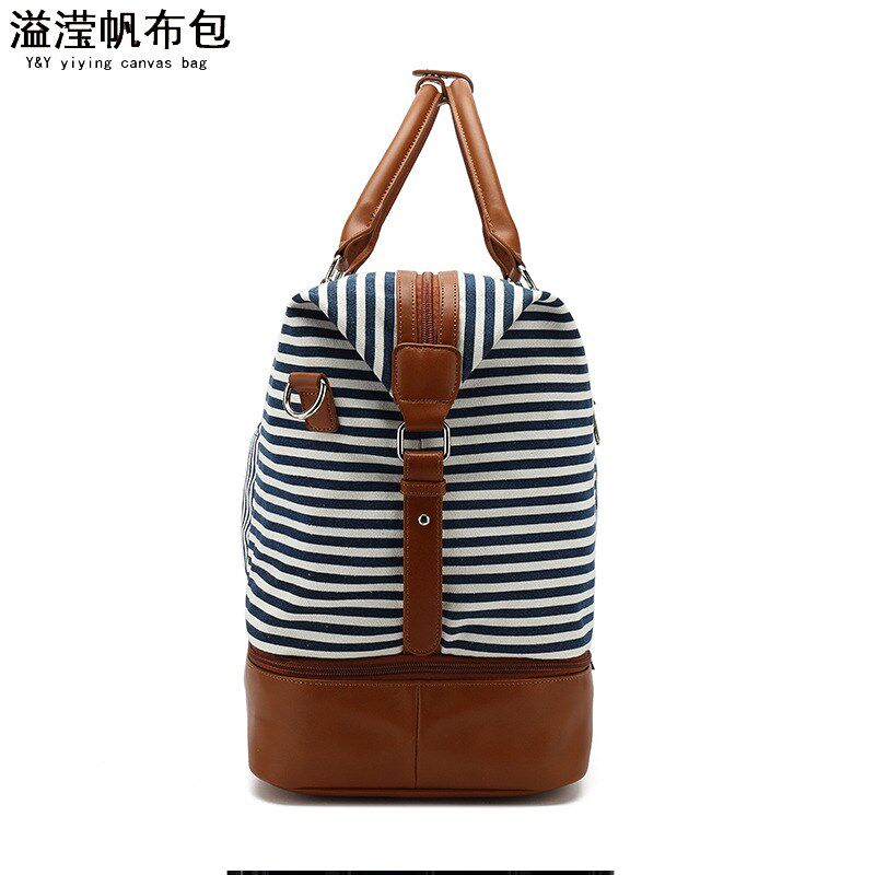 新款时尚条纹旅行包 帆布手提行李包旅行袋收纳运动包干湿分离包