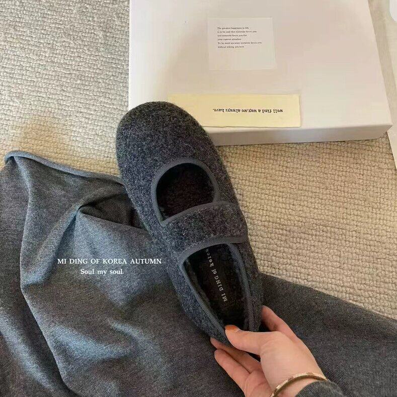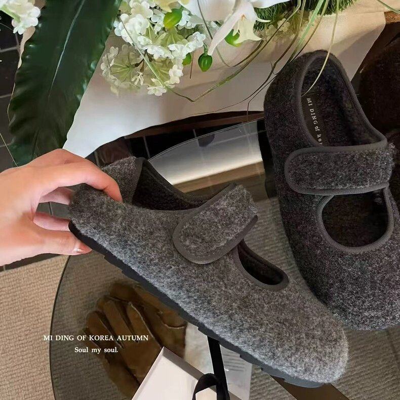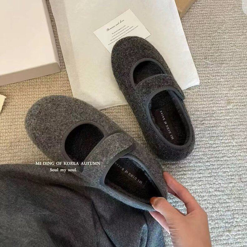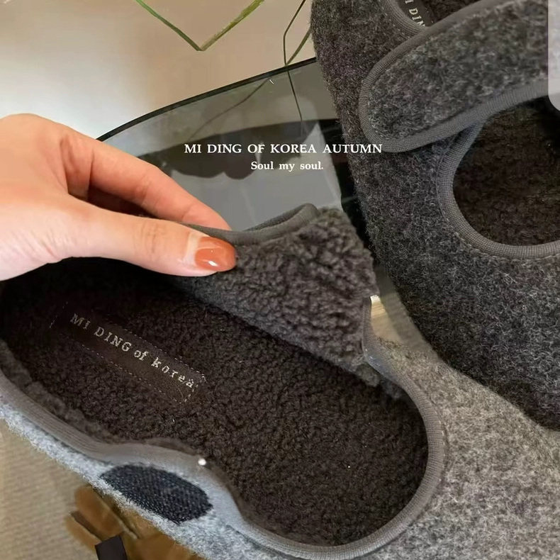 MIDING米町 韩系百搭魔术贴毛毛鞋高级感灰色加绒内增高玛丽珍鞋