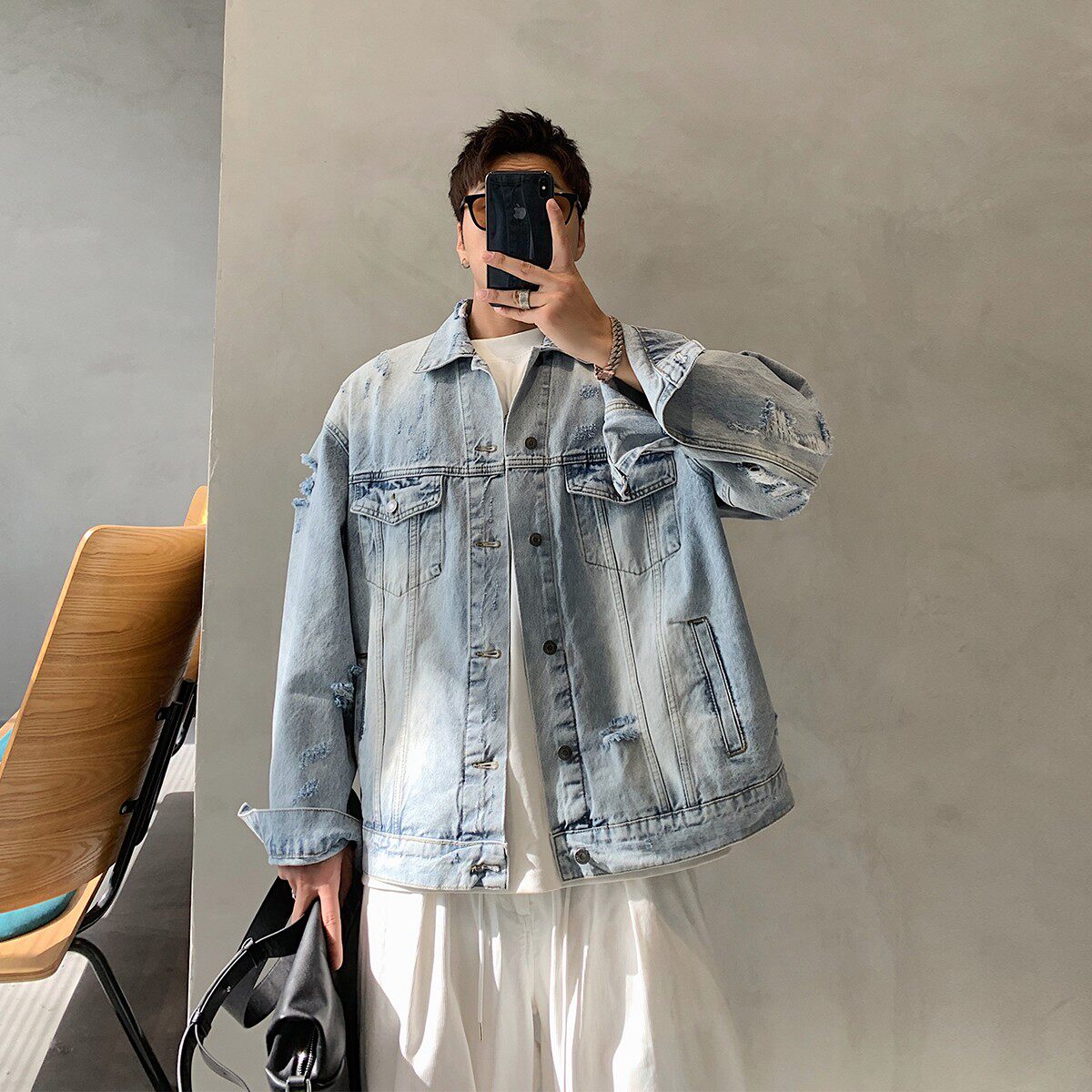 浅蓝色美式复古牛仔外套男款春秋季潮牌高级感痞帅工装夹克牛仔衣