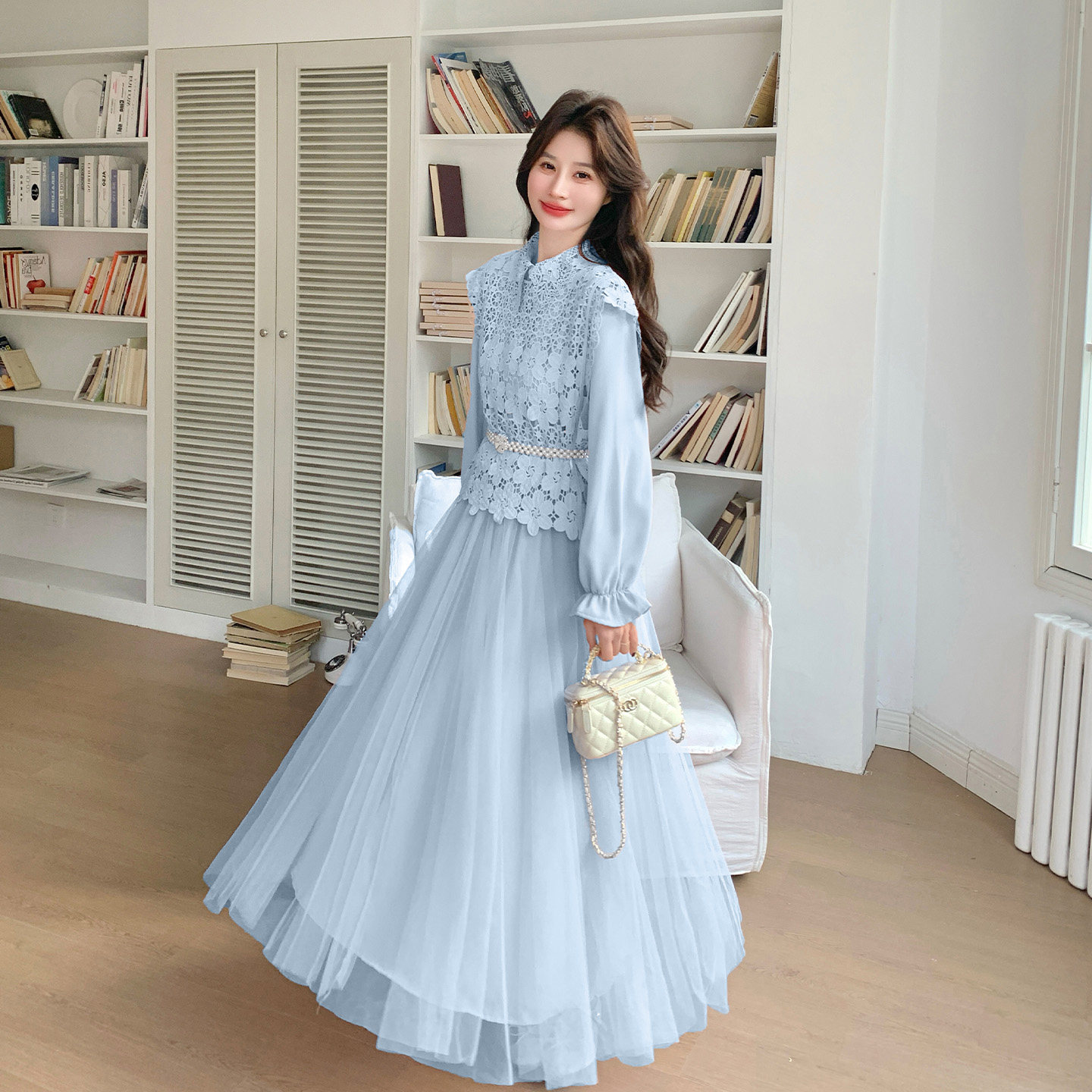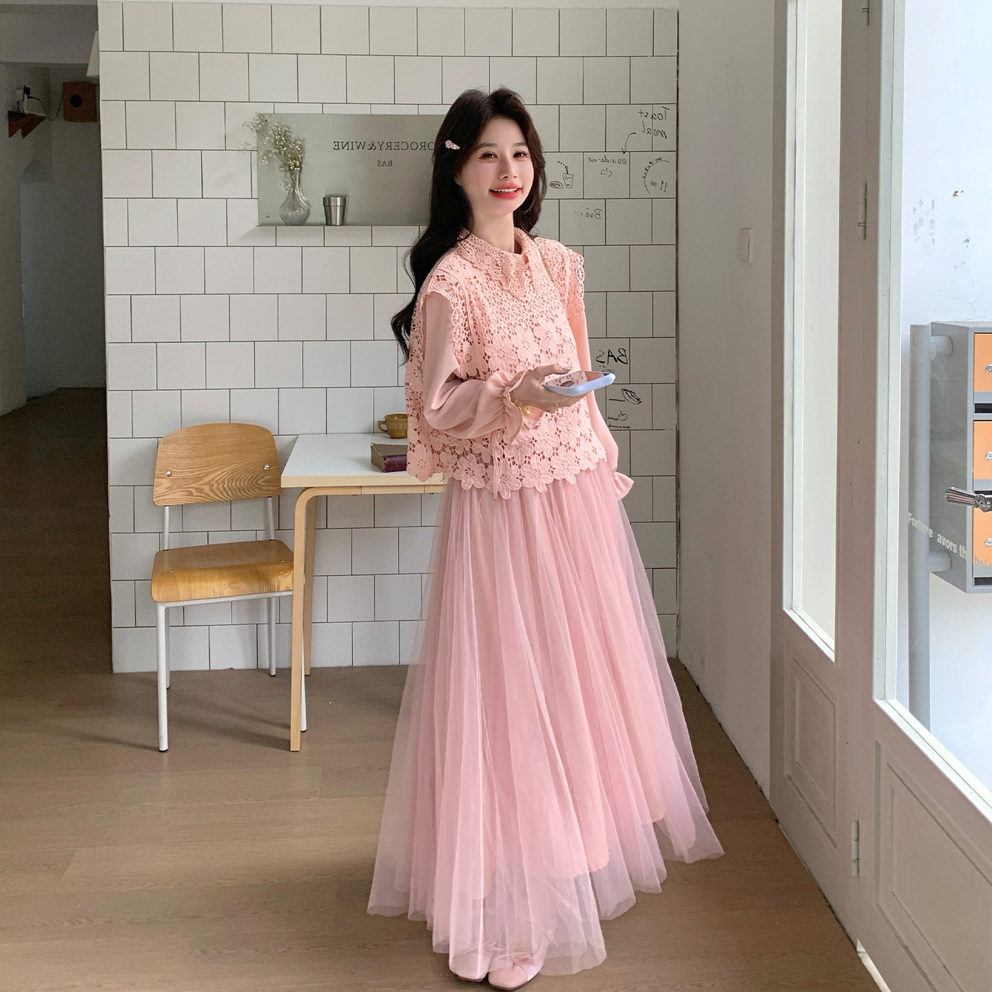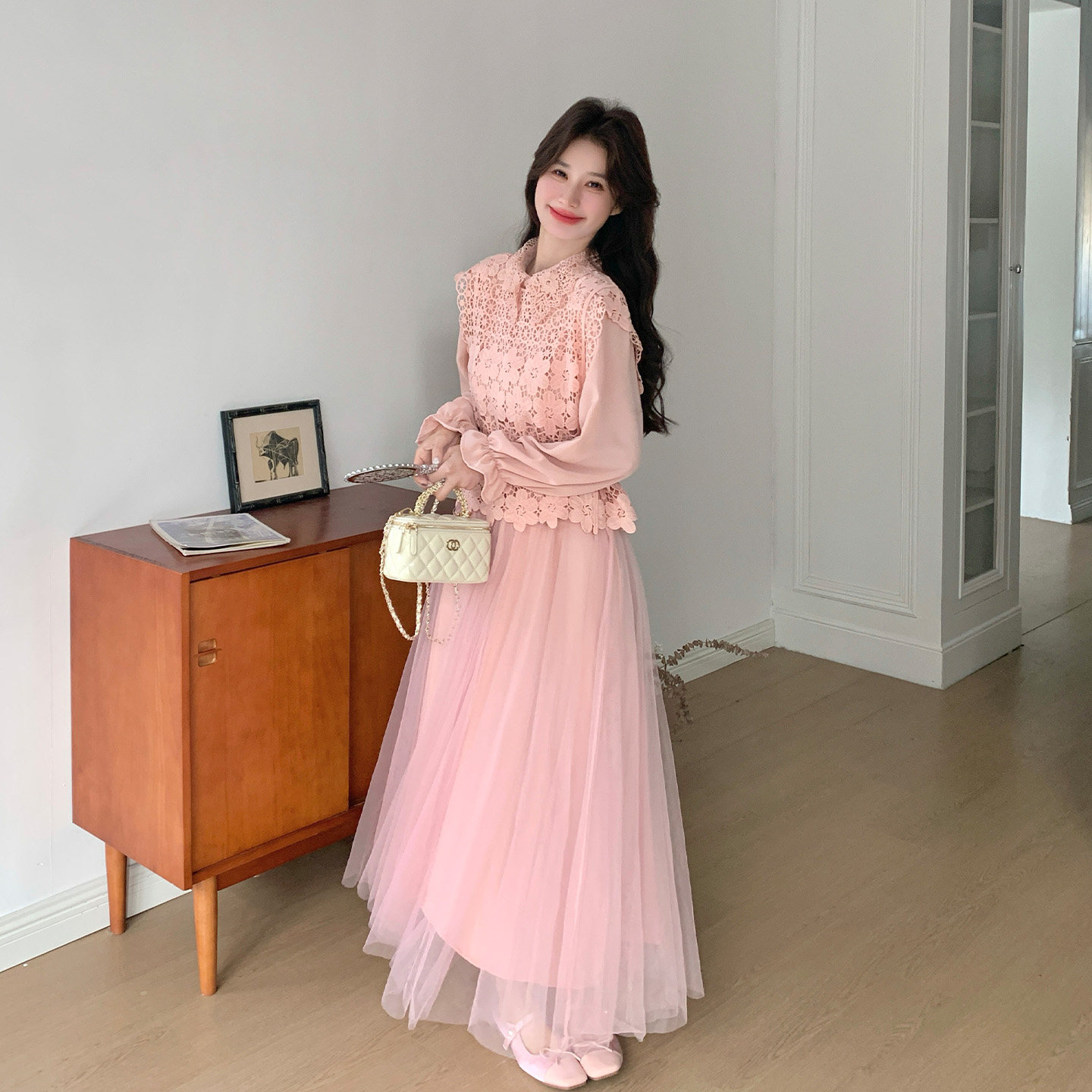 粉色甜美减龄优雅风长袖网纱连衣裙套装2026春新款蕾丝马甲两件套