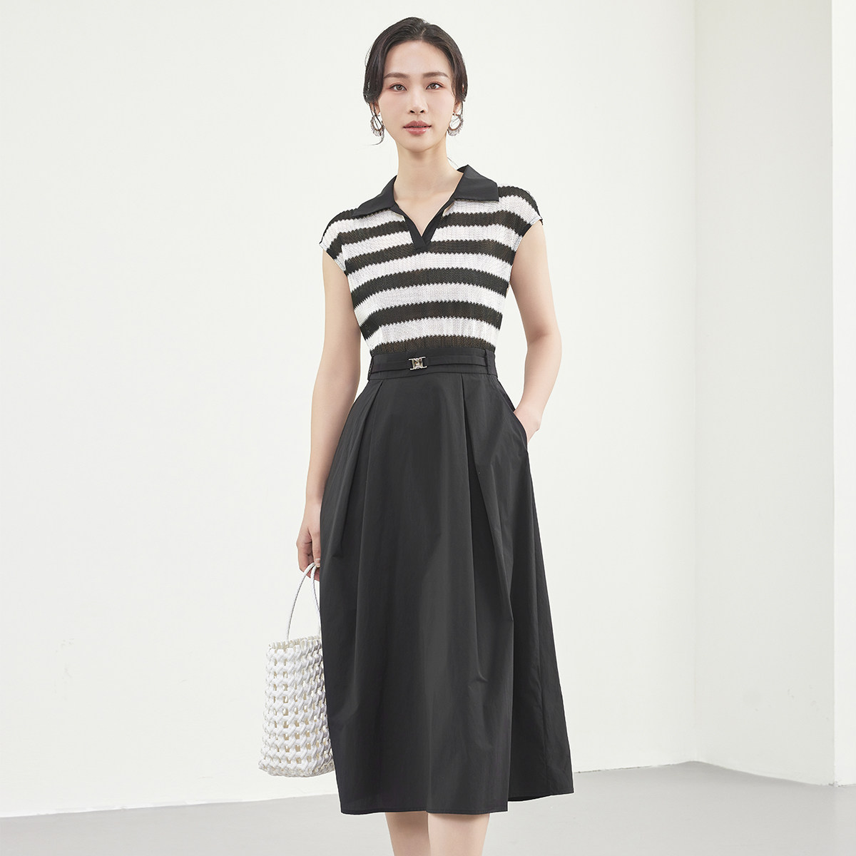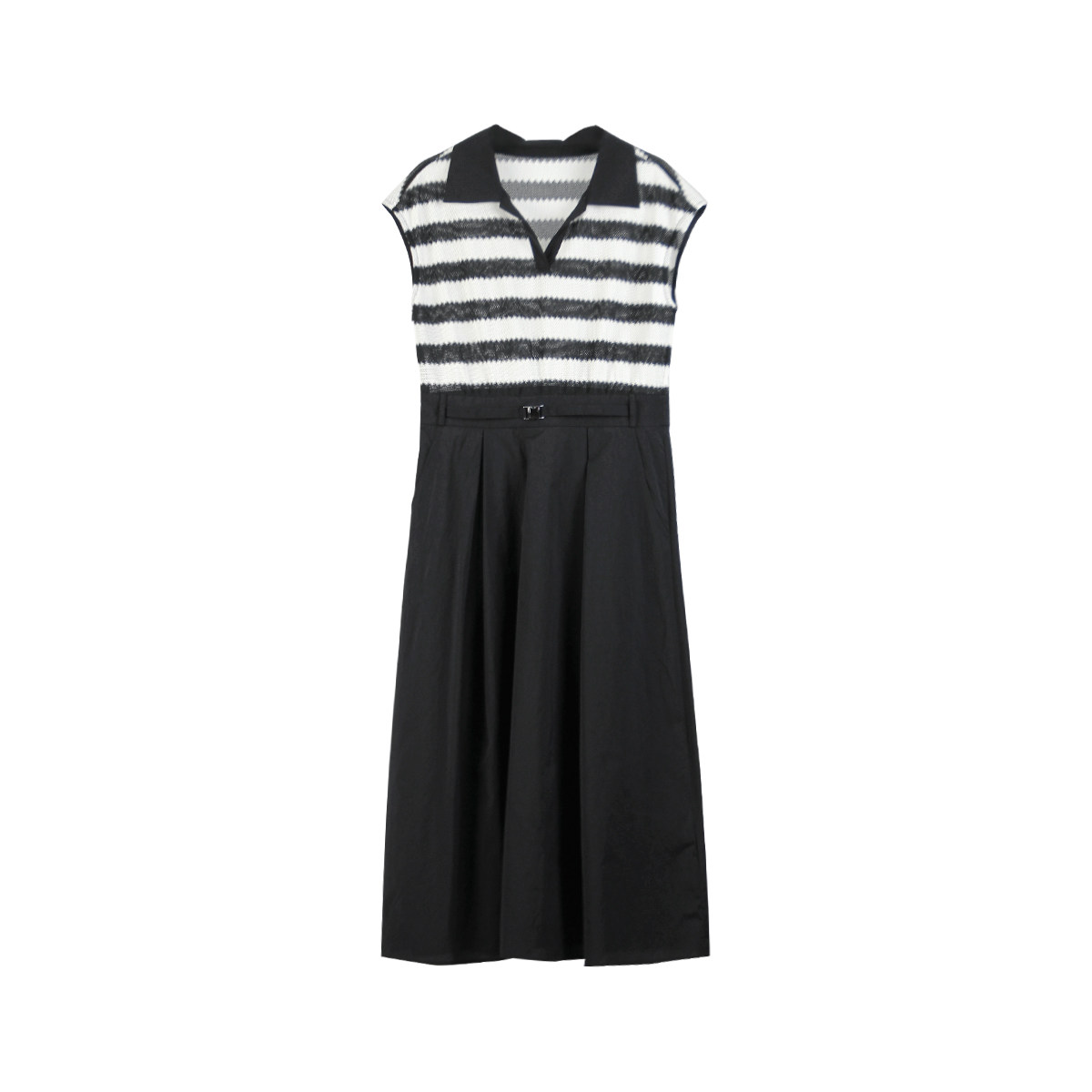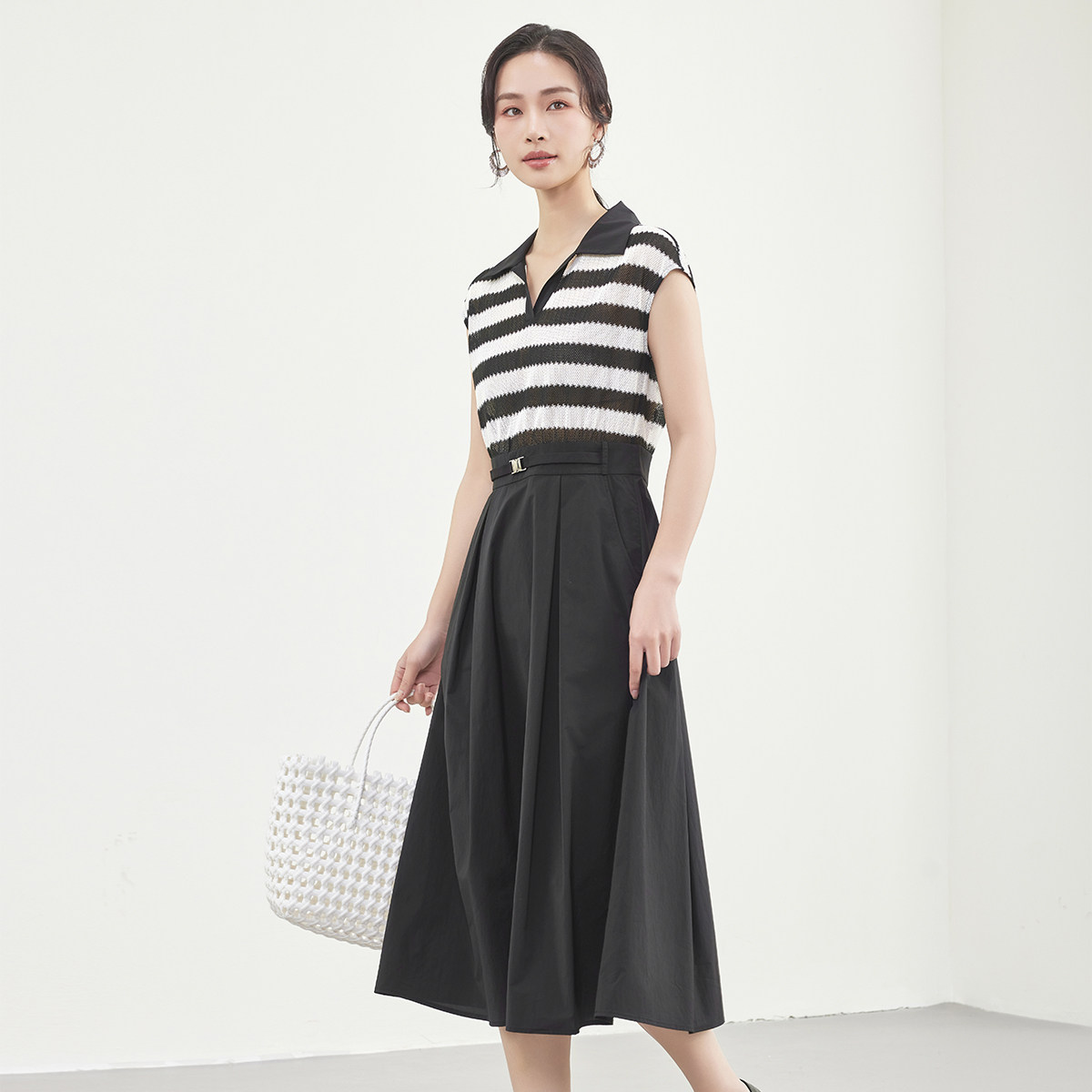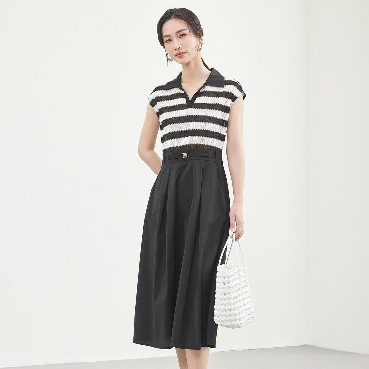 佳人苑连衣裙女2025年夏季新款翻领条纹拼接假两件设计连衣裙日常
