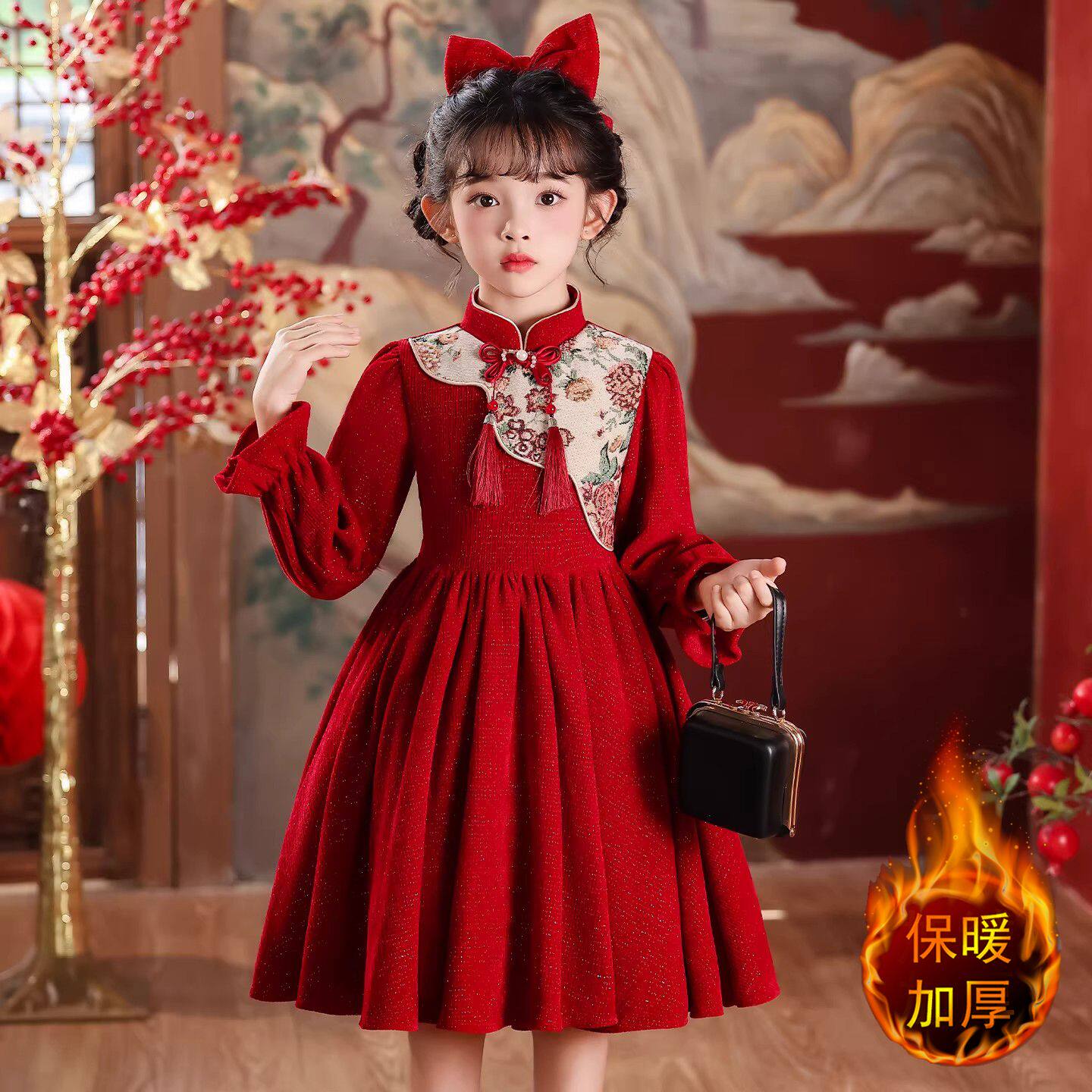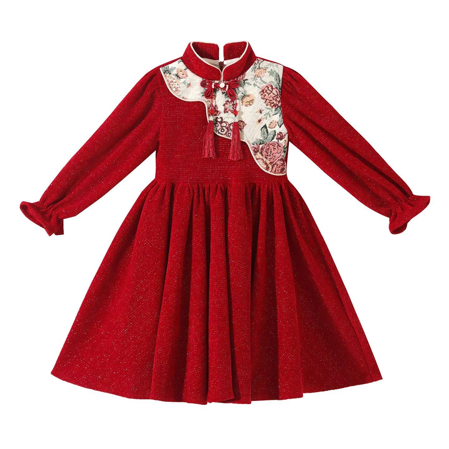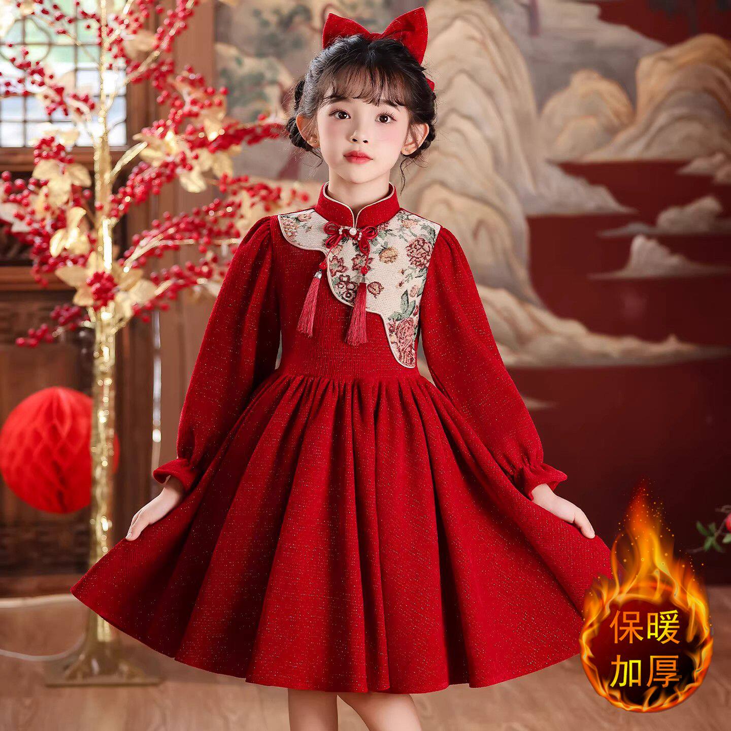 女童秋冬款连衣裙2025新款儿童礼服中大童长袖中国风红色加绒裙子