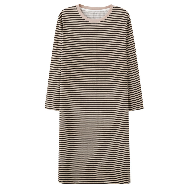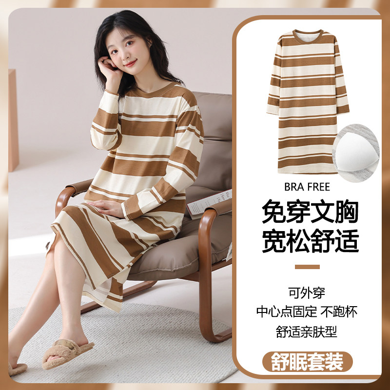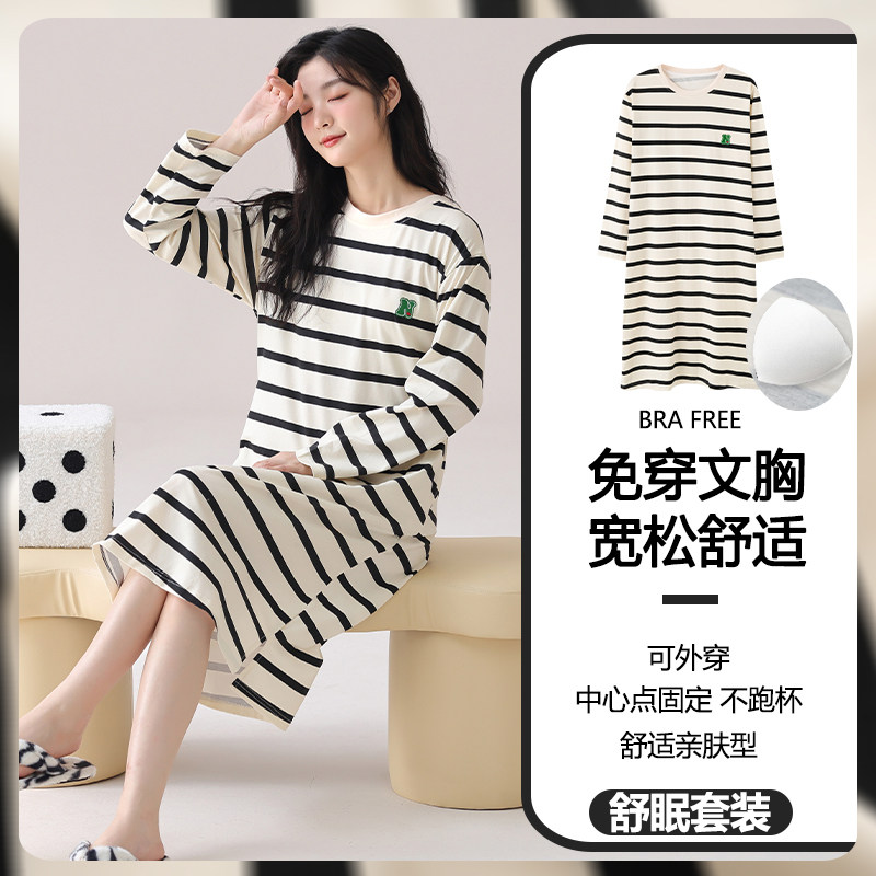 带胸垫睡裙女款春秋季2026新款长袖纯棉条纹休闲连衣裙睡衣家居服