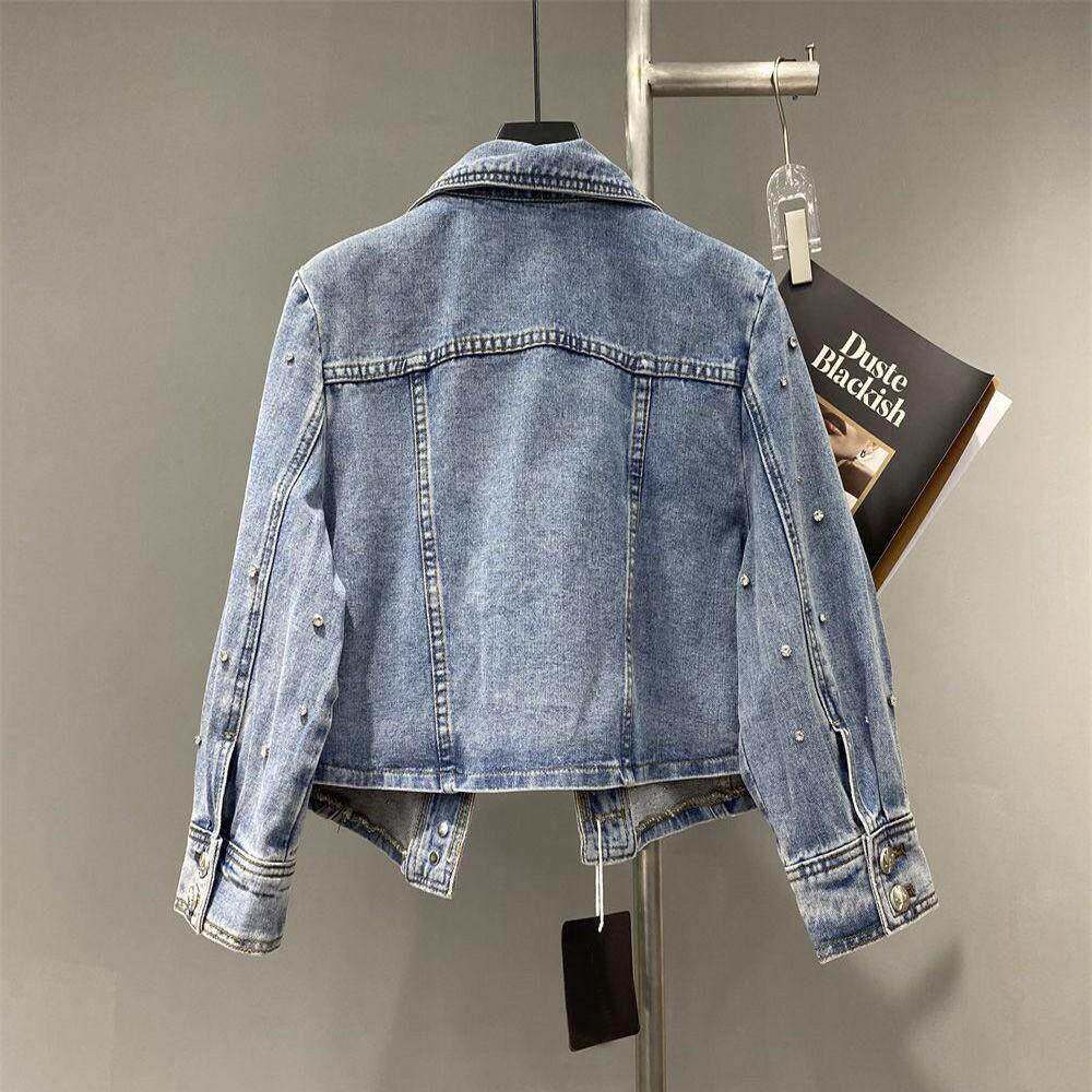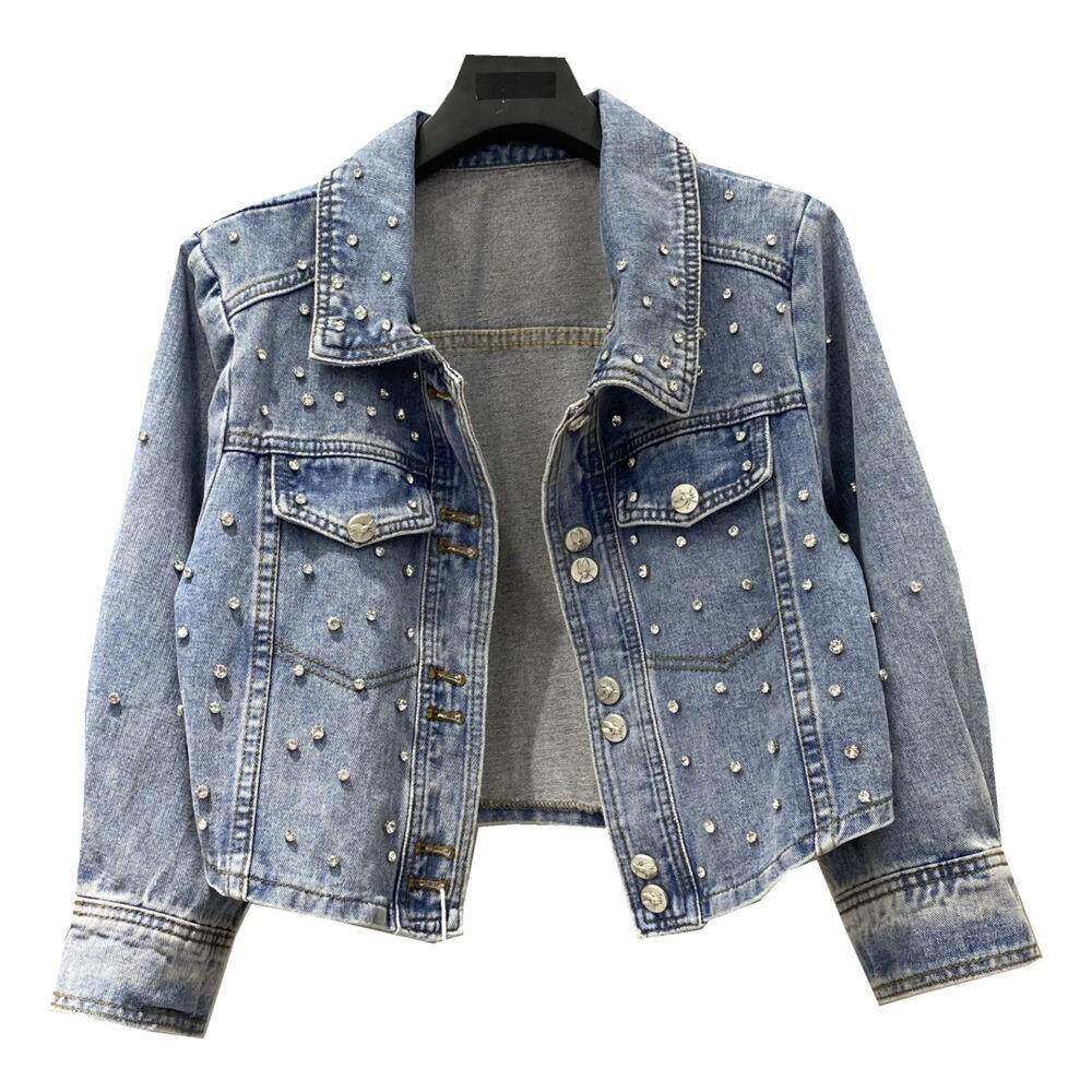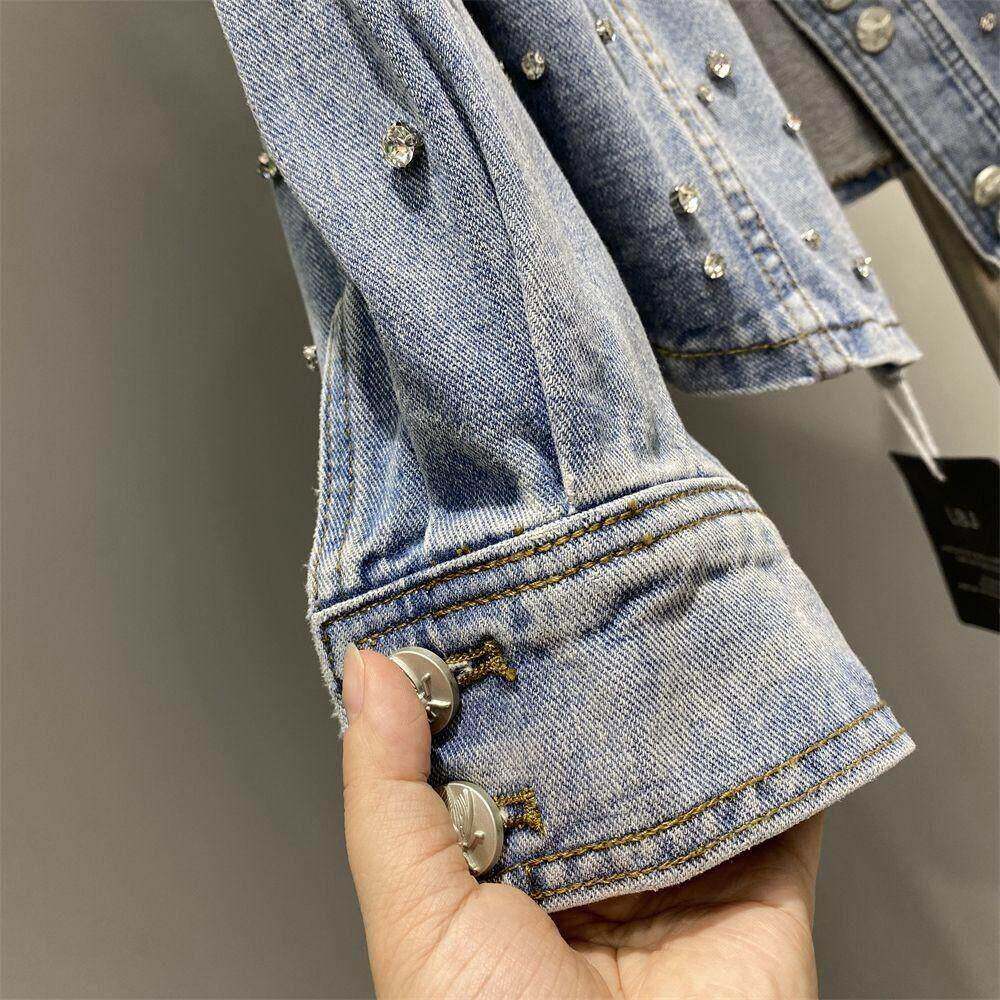 香港时尚百搭重工镶钻七分袖牛仔外套女款春装薄款开衫上衣牛仔衣