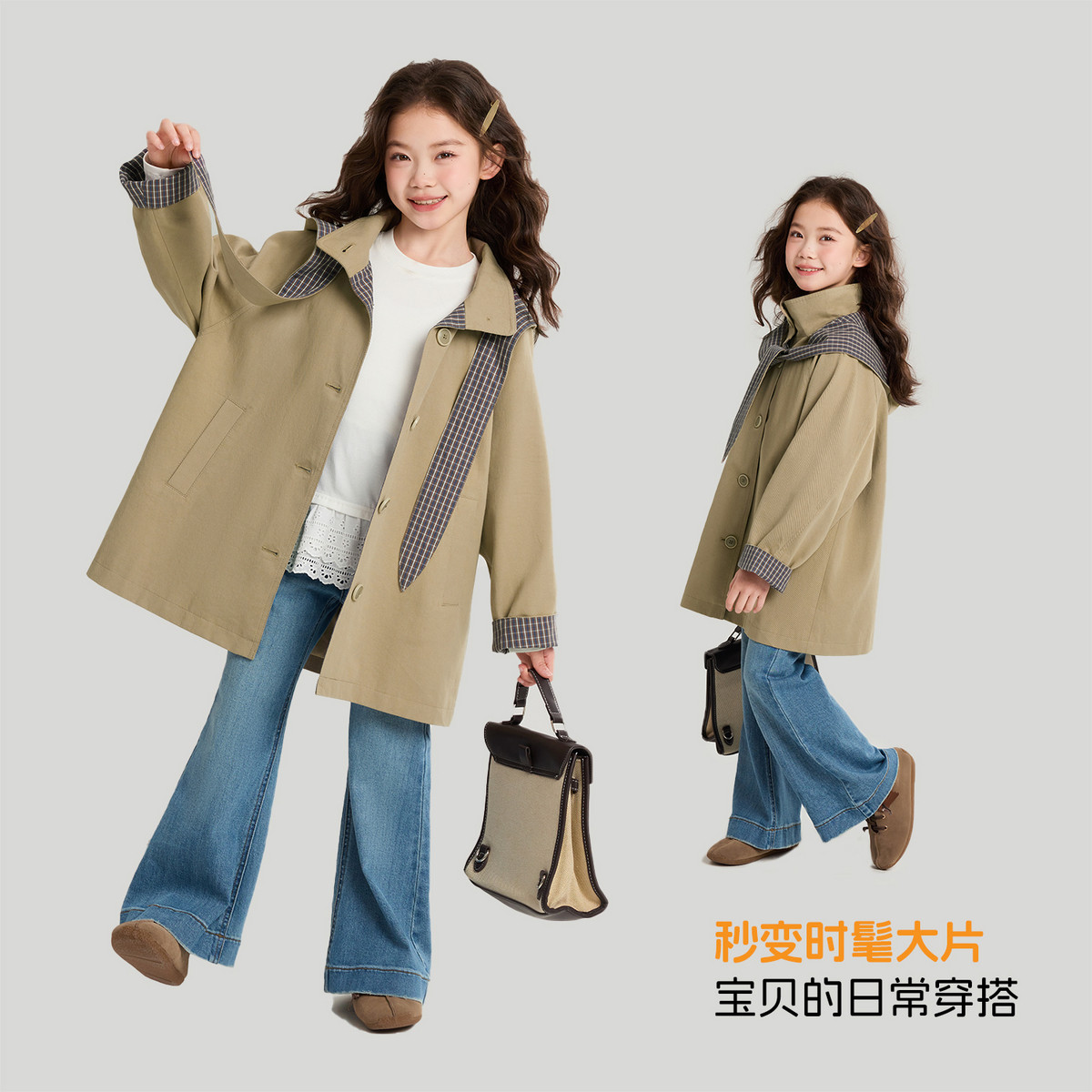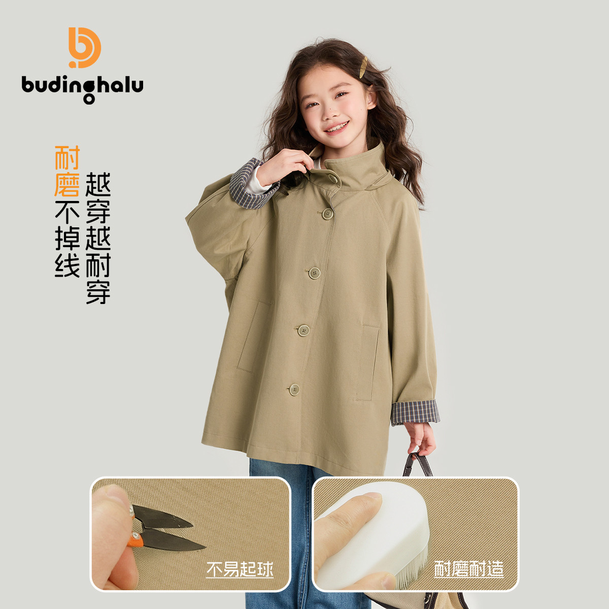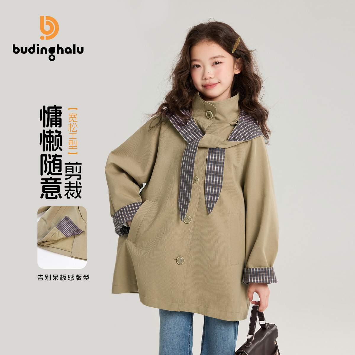 布丁哈鲁春装女童童装上衣2026春季新款儿童撞色格纹风衣外套