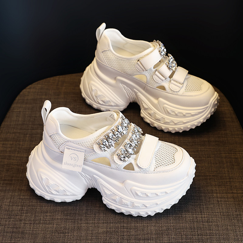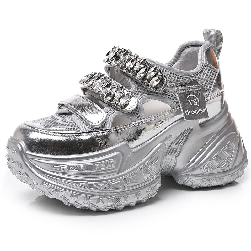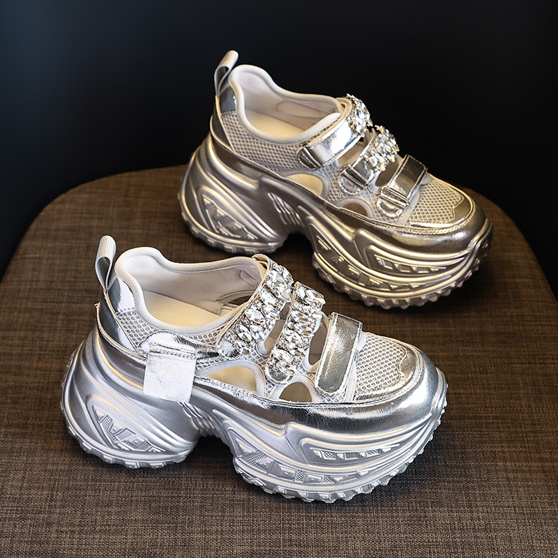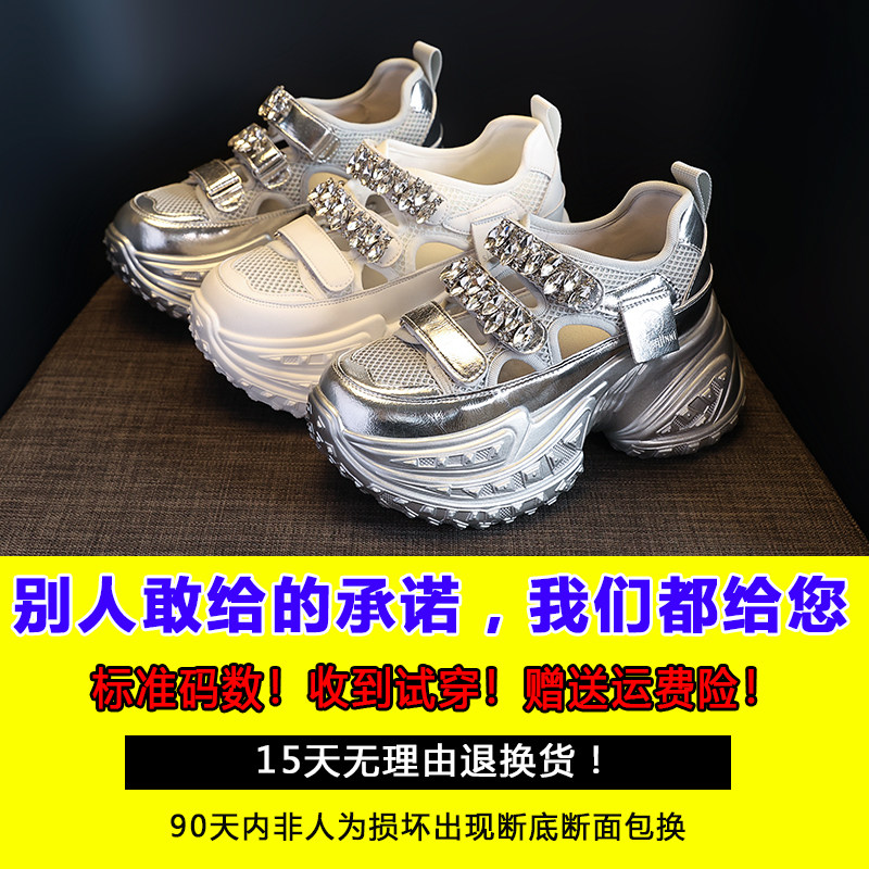 银色老爹鞋女夏季薄款2026新款爆款透气网面镂空厚底内增高小白鞋