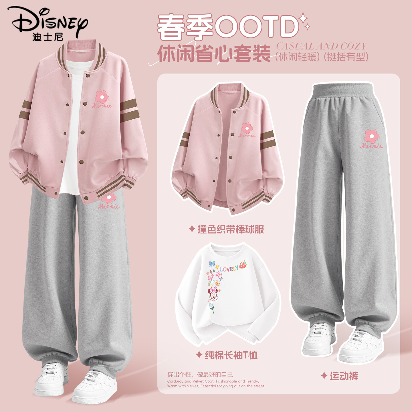 迪士尼女童春装薄款套装2026新款春季运动裤洋气儿童棒球服外套女