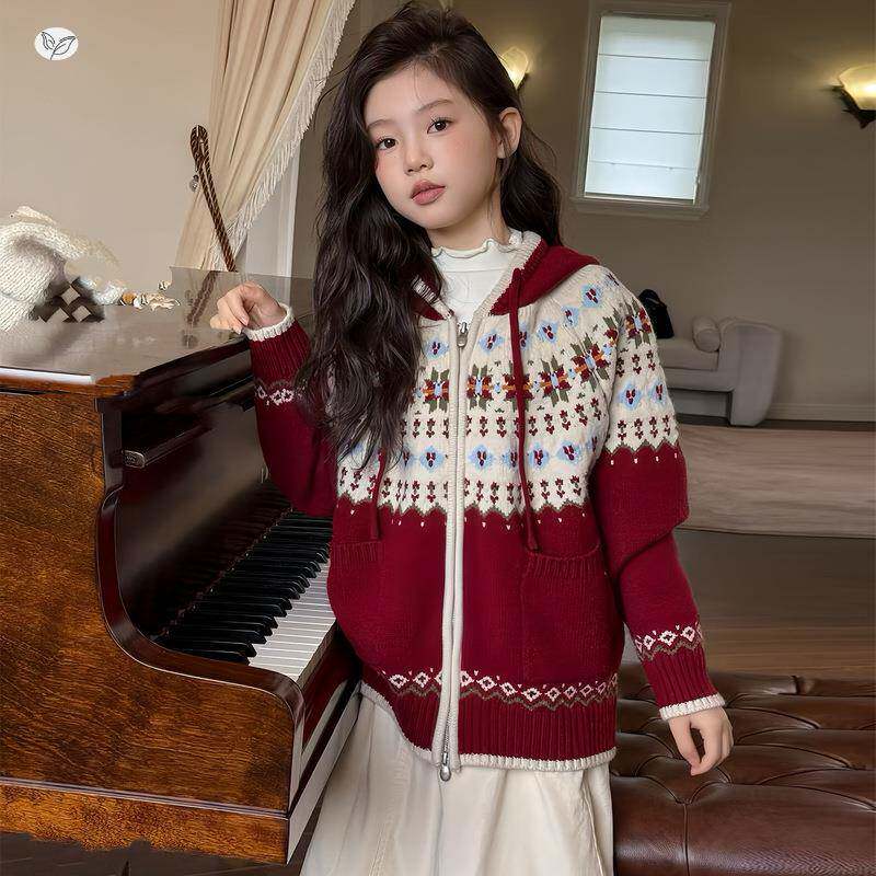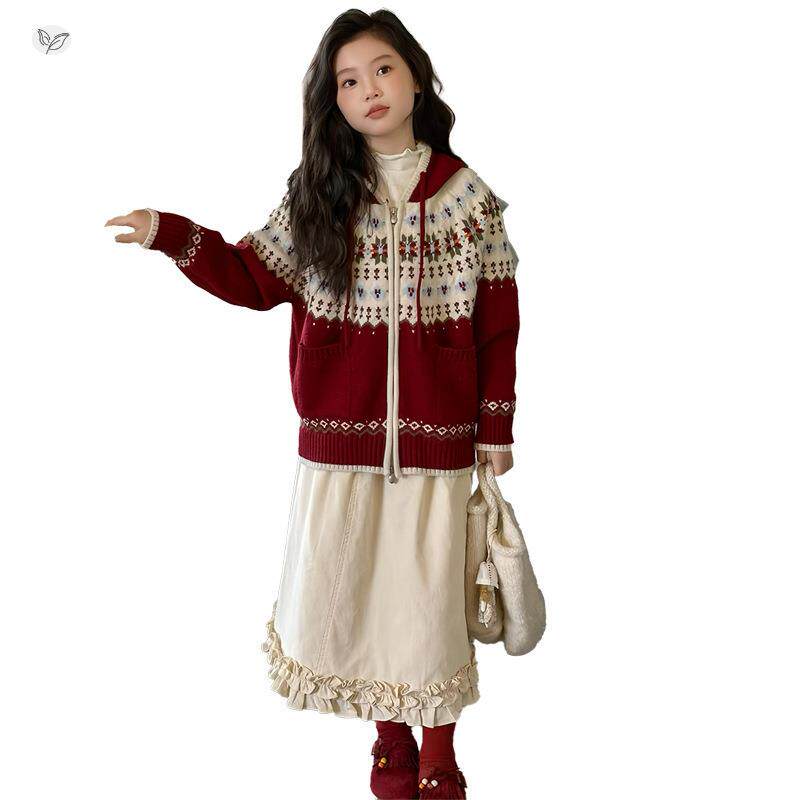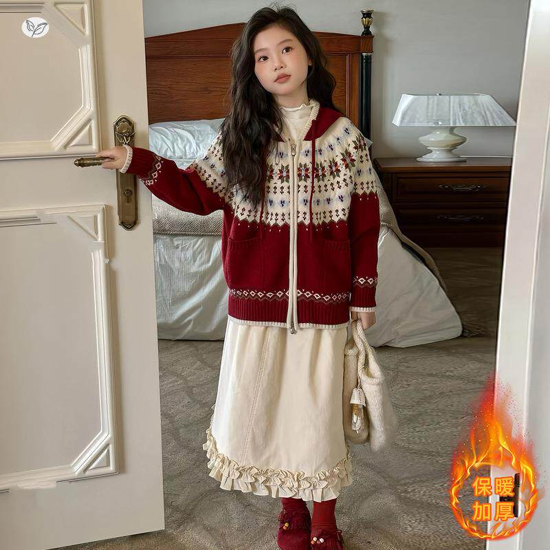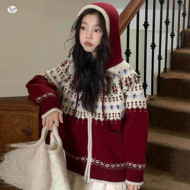 女童2025年春新款圣诞可毛衣女大童提花连帽针织衫外套内搭秋外穿