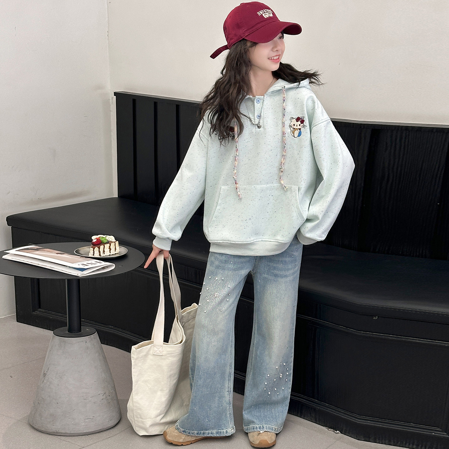 女童春秋卫衣套装2026新款韩版休闲连帽衫牛仔裤中大童炸街两件套