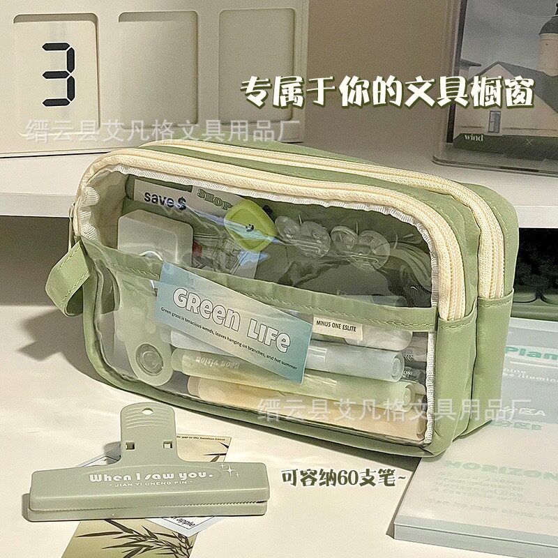 透明层手提式笔袋女生大容量高颜值文具盒初中小学生简约收纳袋透明高级实用笔盒儿童初中生简约ins风笔袋本