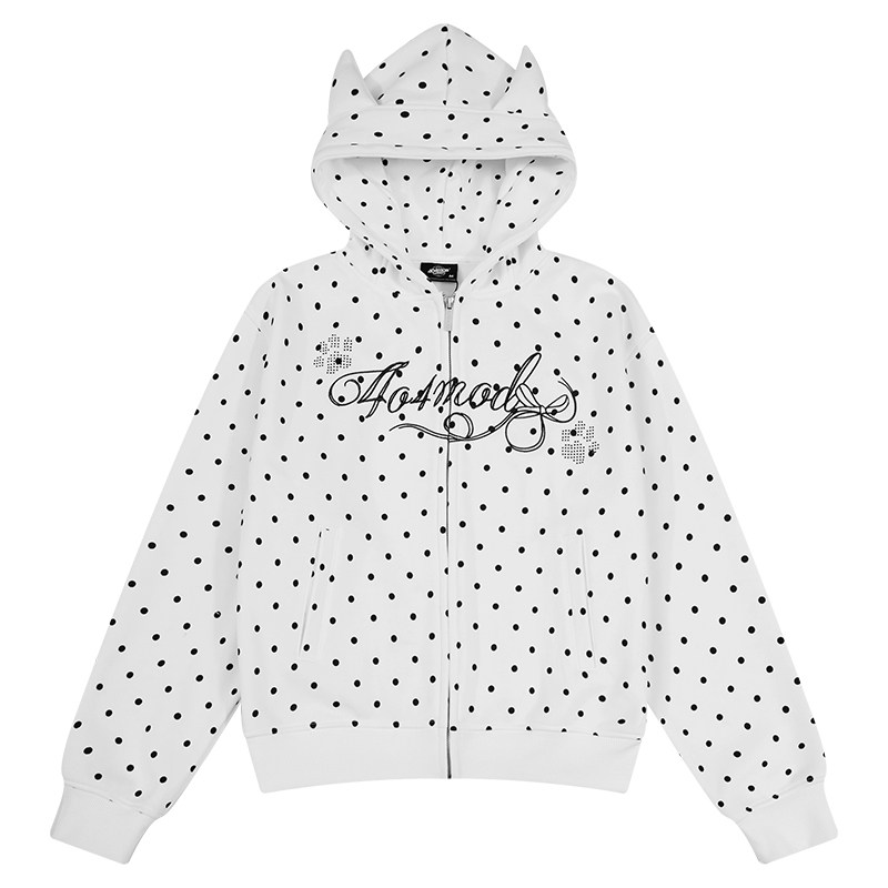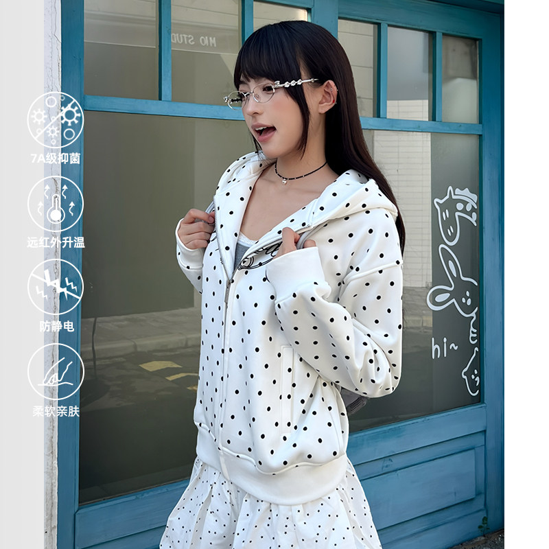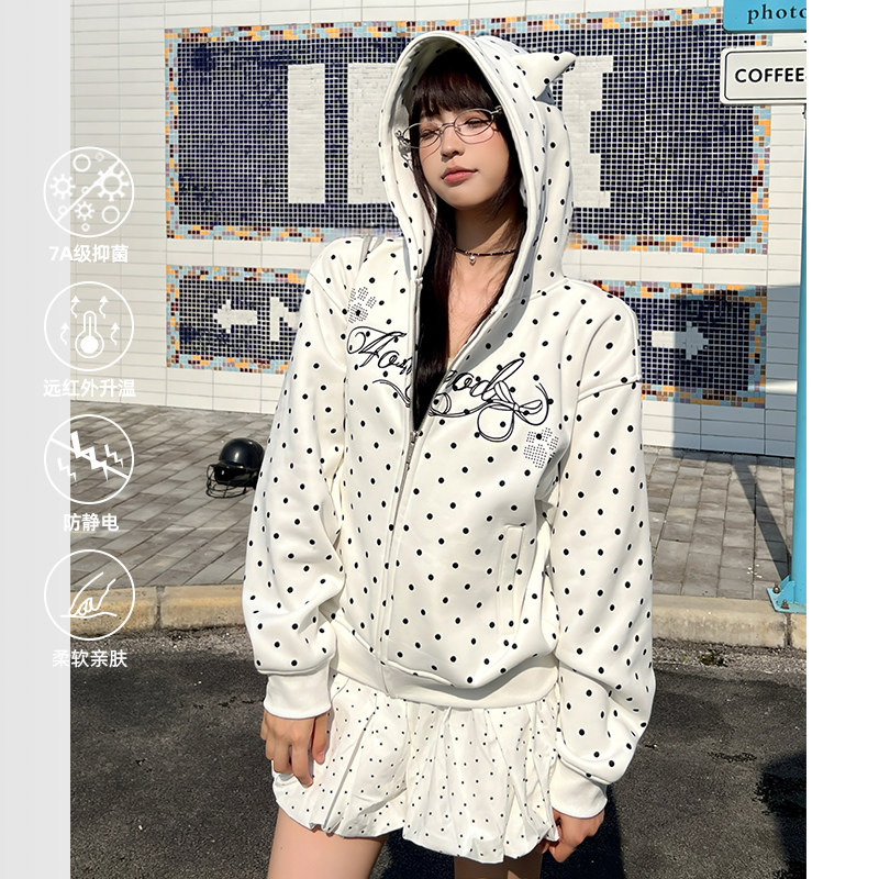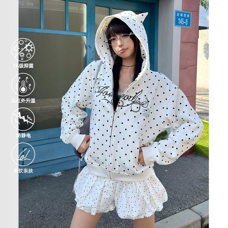 404MOB刺绣可爱耳朵复古波点连帽开衫卫衣女款短款秋冬加绒厚外套
