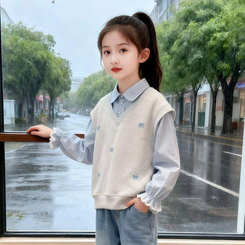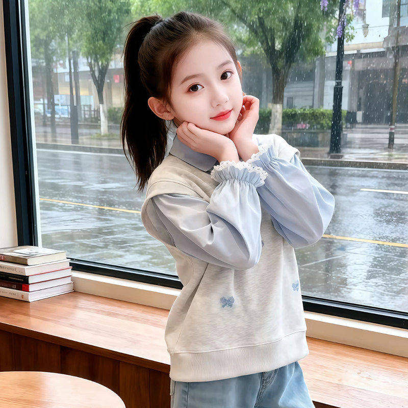 女童假两件卫衣春秋款2026新款儿童衬衫领上衣春装女孩洋气polo衫