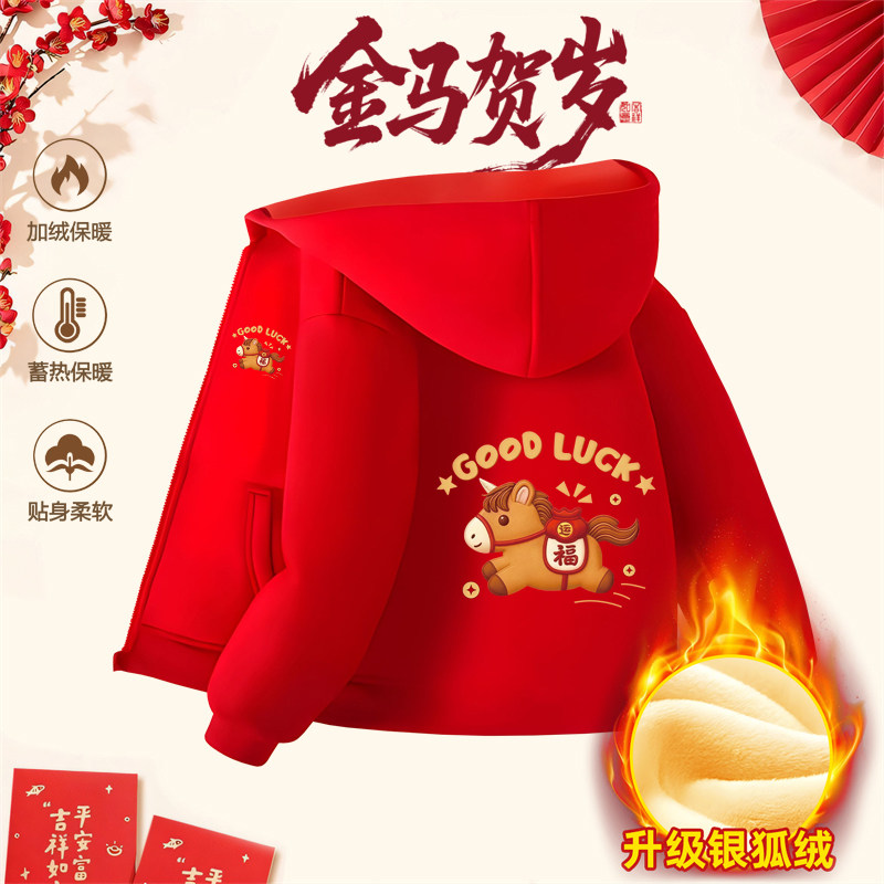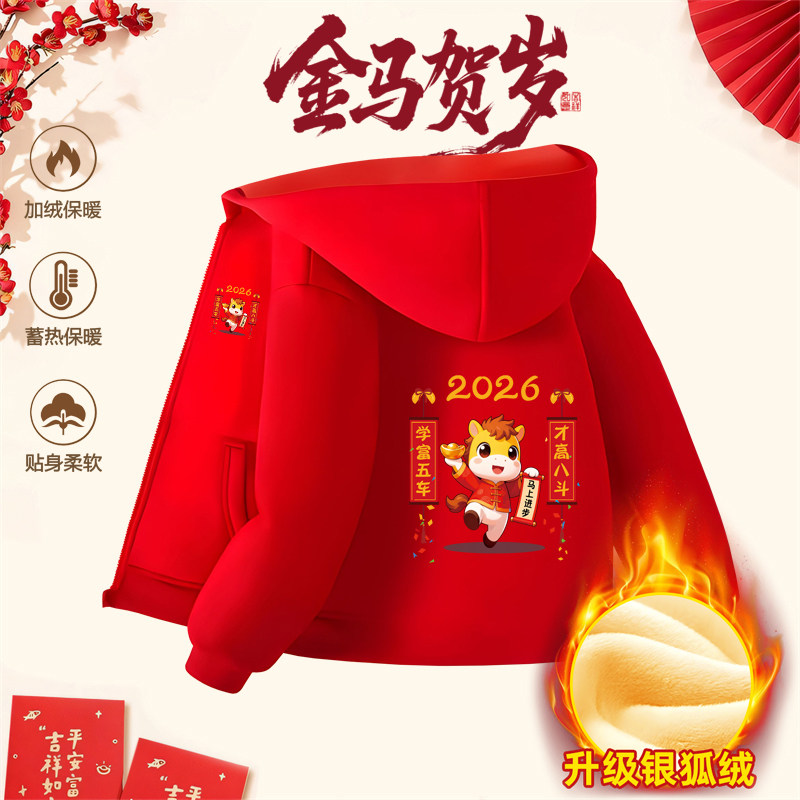 男童马年外套加绒2026拉链红色中大儿童新年开衫拜年新款女童