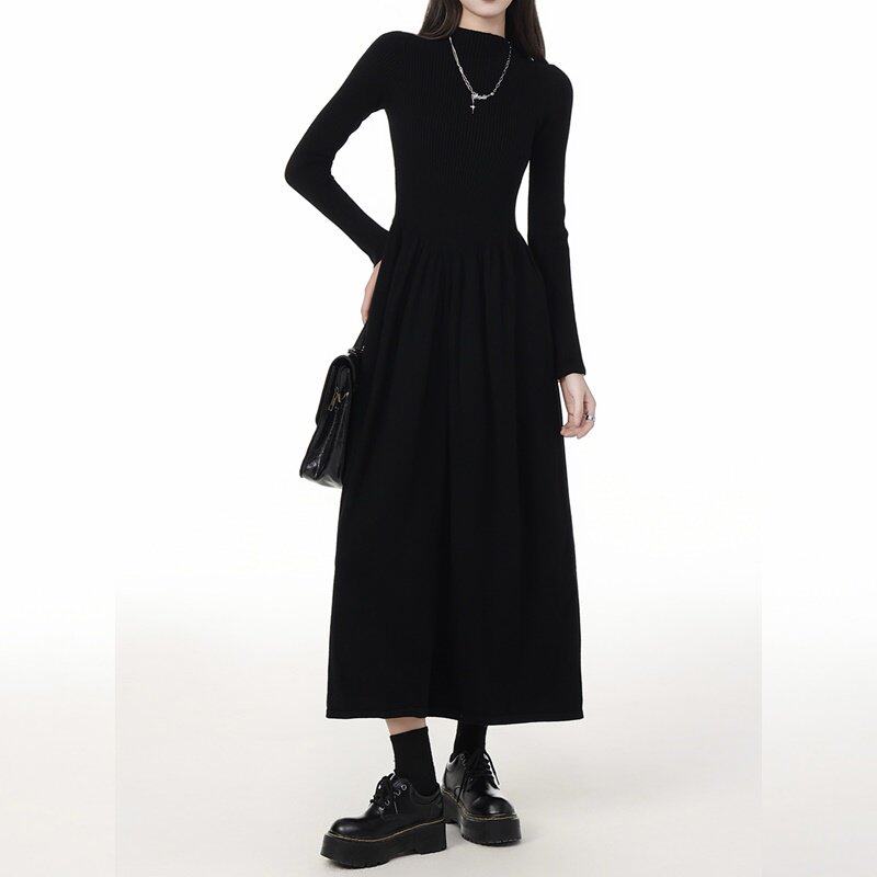 黑色半高领长袖连衣裙女2025秋冬新款小个子收腰显瘦修身中长款裙