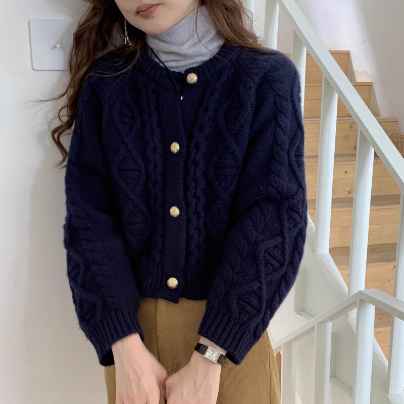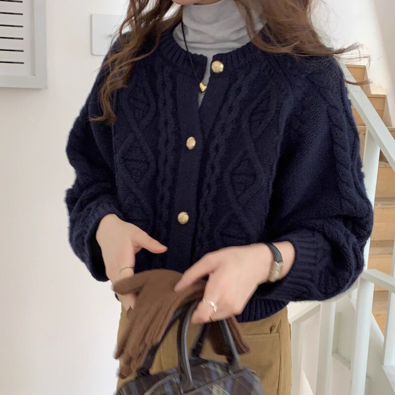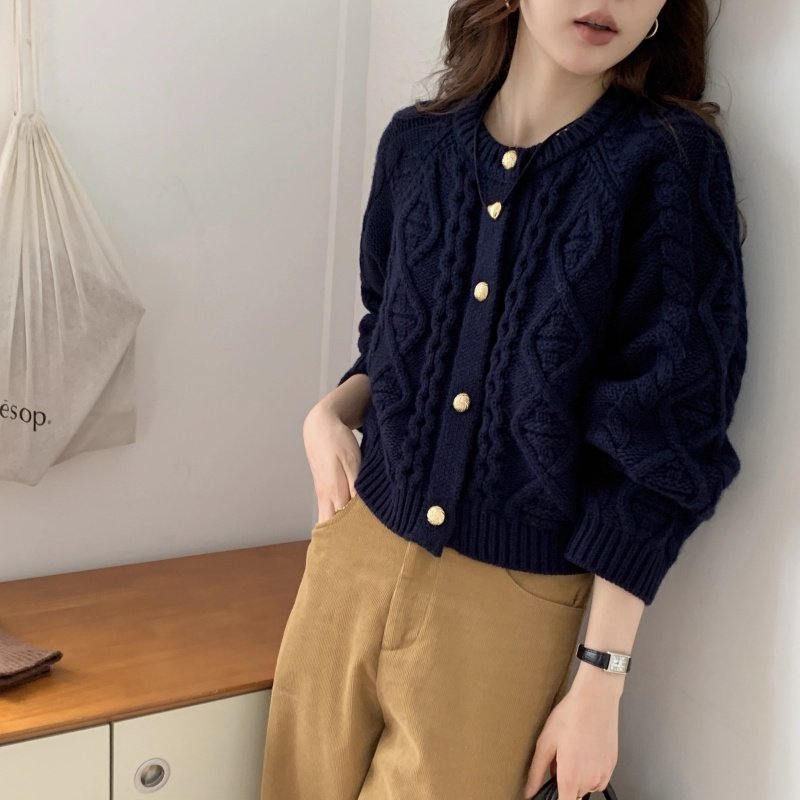 重磅加厚100%纯羊毛开衫女圆领菱形绞花短款外套宽松长袖毛衣外搭