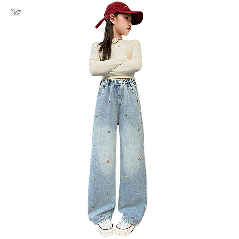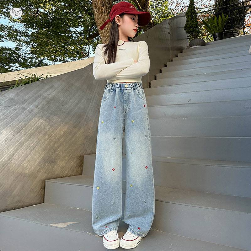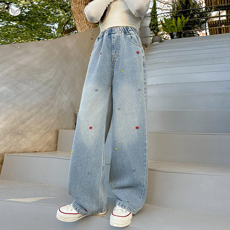 彩色刺绣花朵牛仔裤女童2026春季新款窄版阔腿裤中大童直筒裤春秋