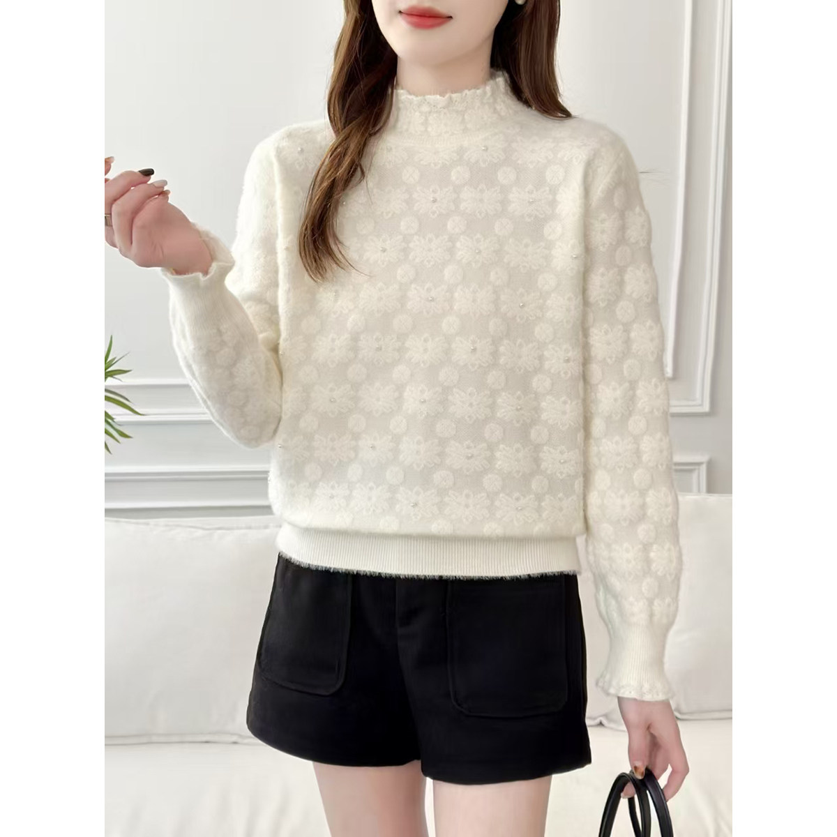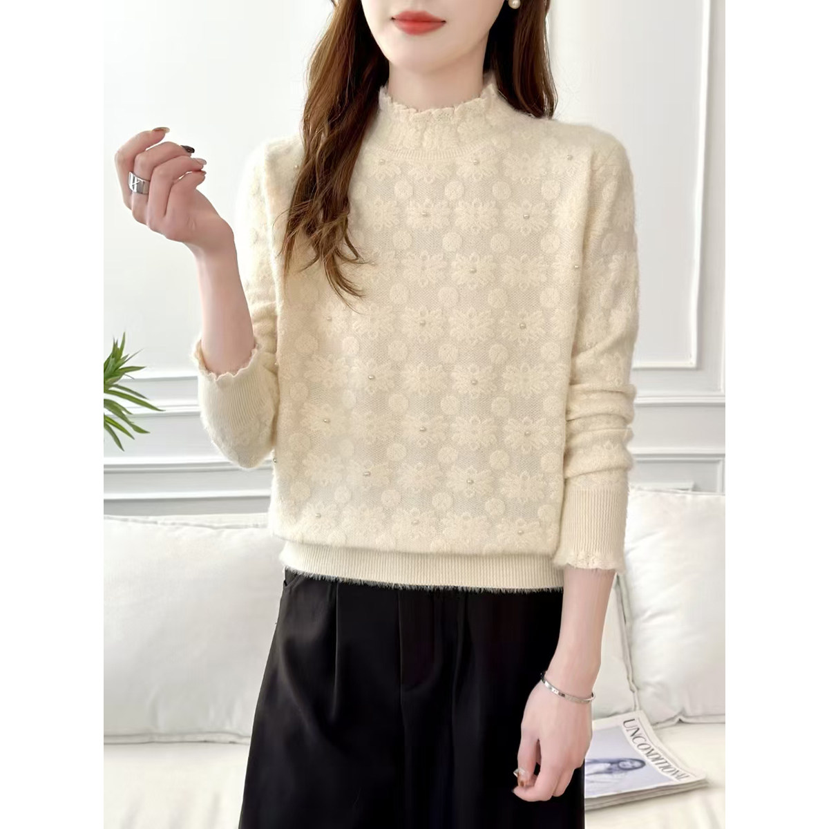 绒蕾丝半高领毛衣女款2025新款冬季钉珠针织打底衫秋冬内搭可外穿