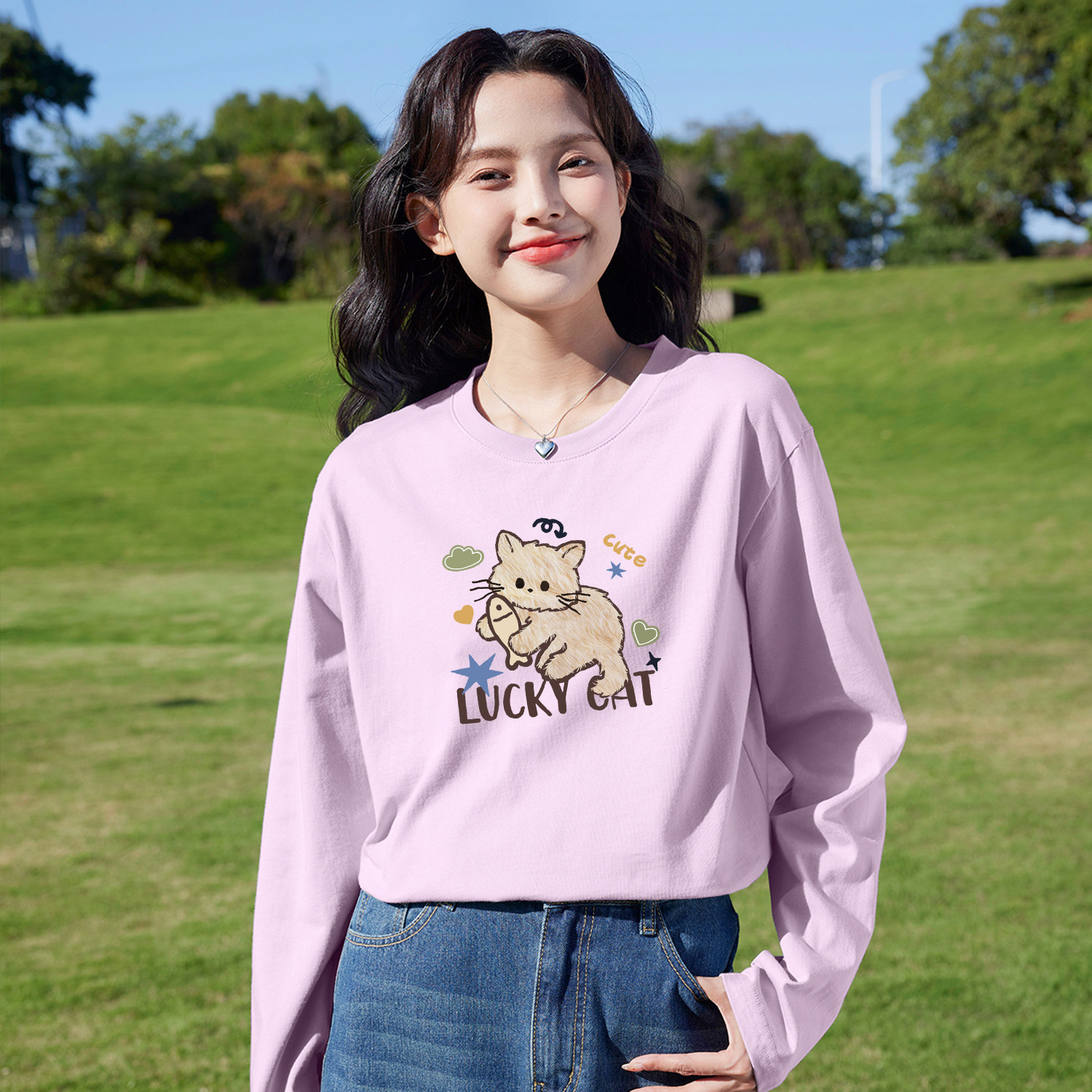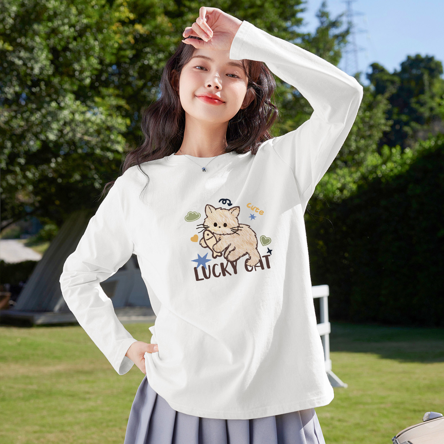 班尼路杏色纯棉长袖t恤女款2026春季新款小猫印花内搭打底衫上衣H