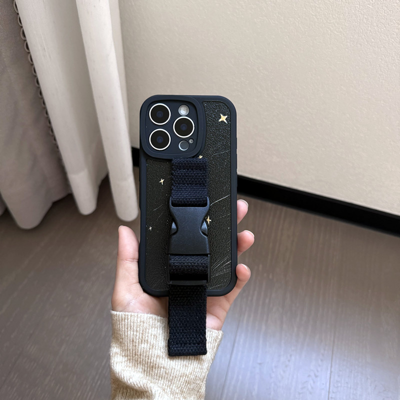 潮牌皮纹黑色星空适用苹果17 16 15 14Pro Max手机壳腕带iPhone13 12华为mate60 pura70小米15皮纹定制型号