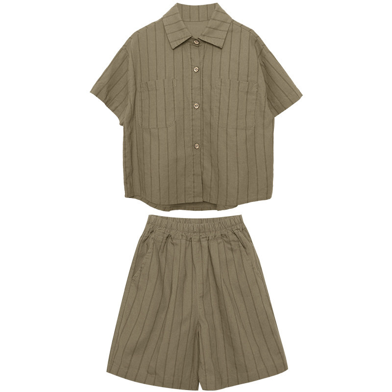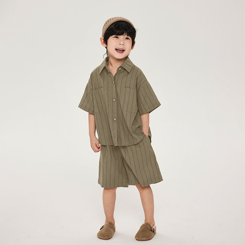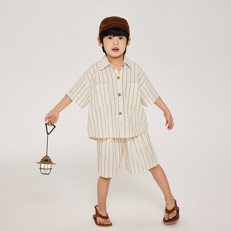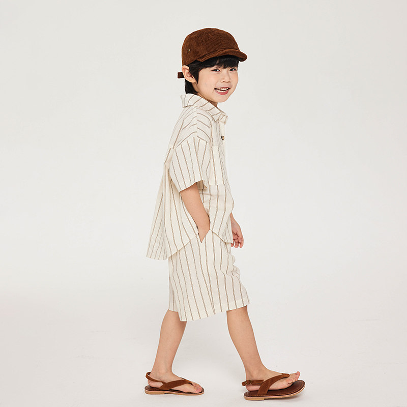 积木城堡男童套装夏装2026新款儿童中小童棉麻条纹短袖短裤两件套