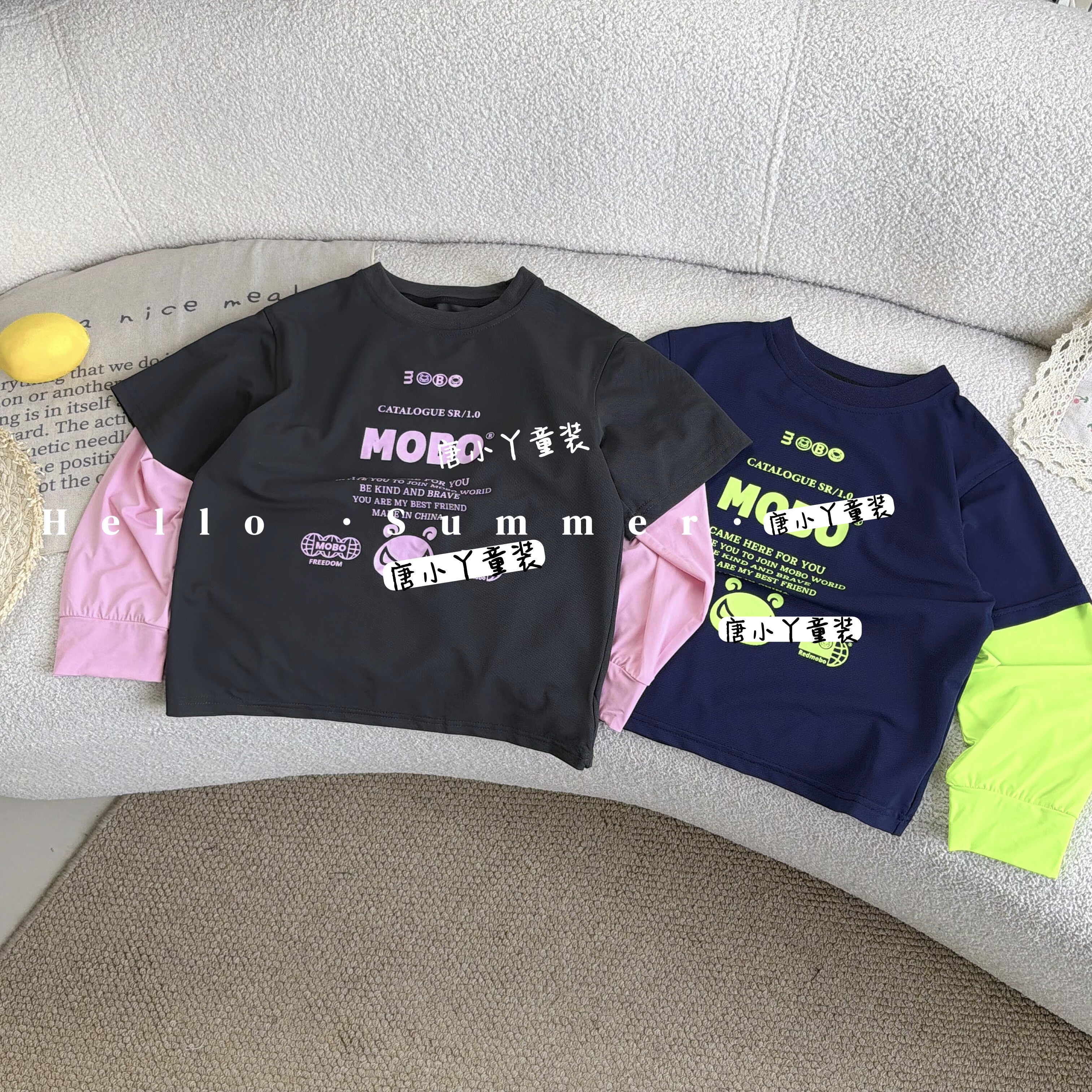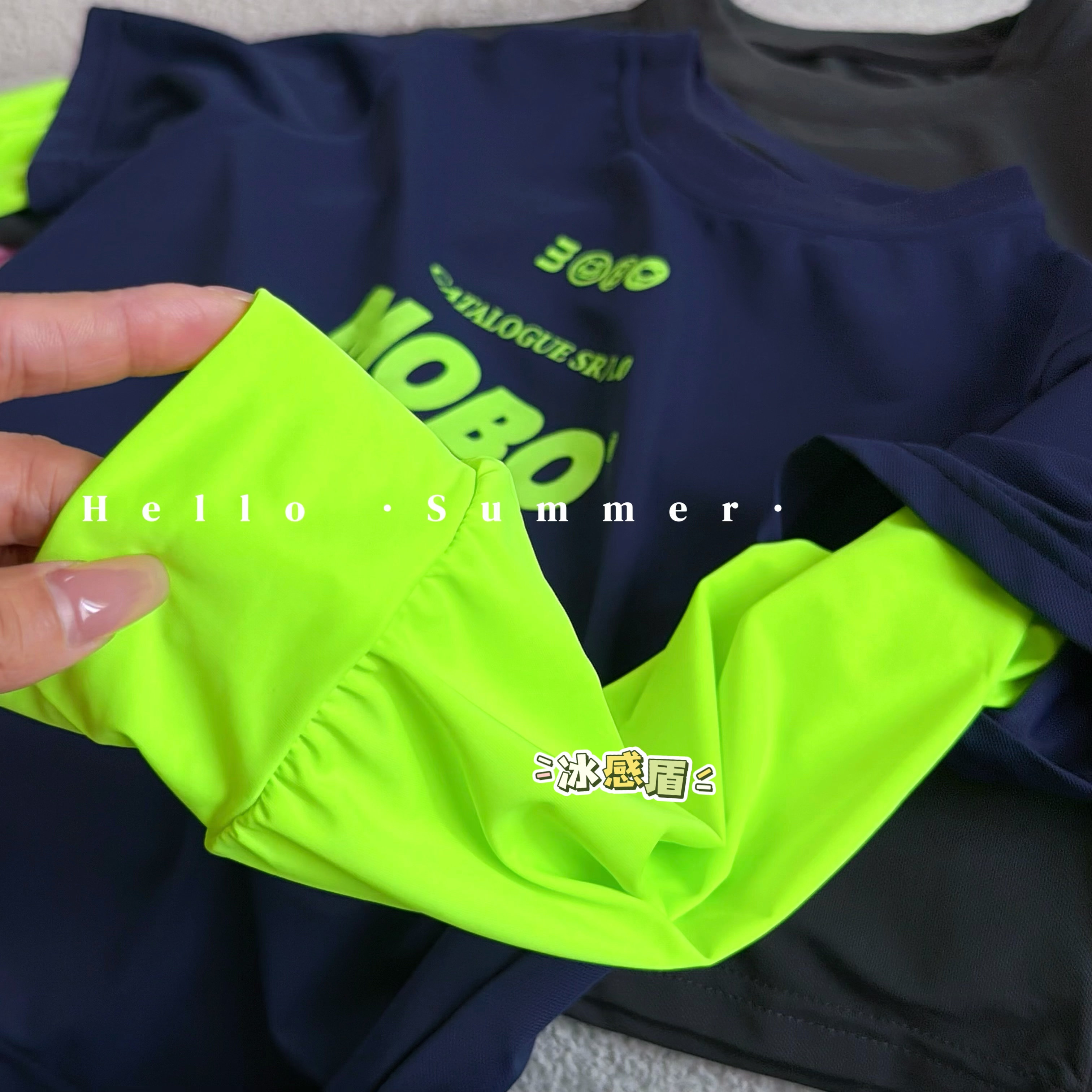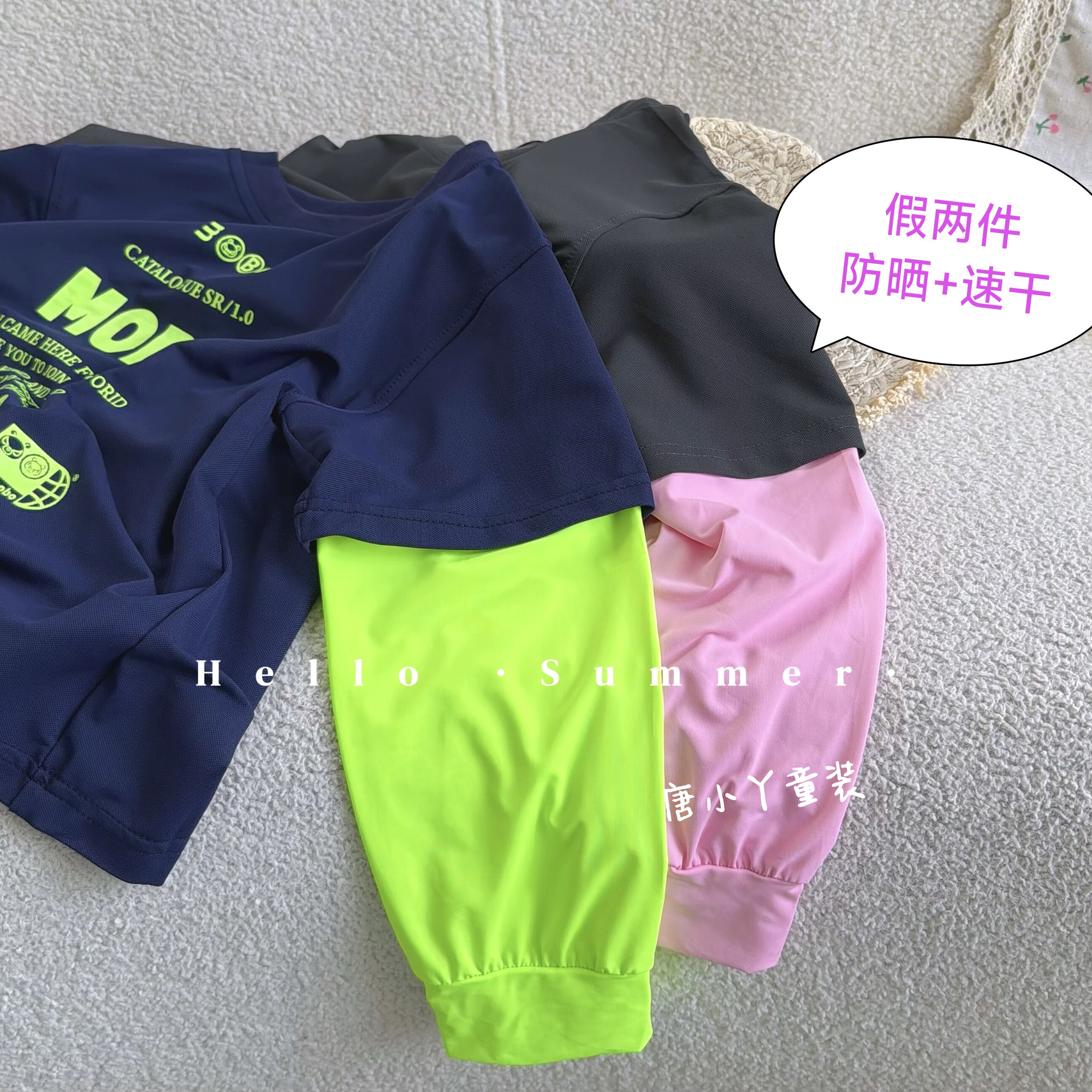 中大童假两件速干长袖T恤动感珠地粉灰撞色藏青荧光绿冰感防晒袖