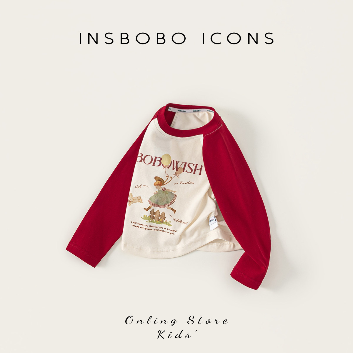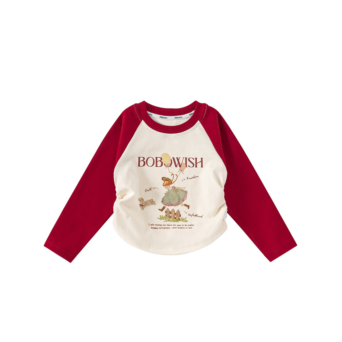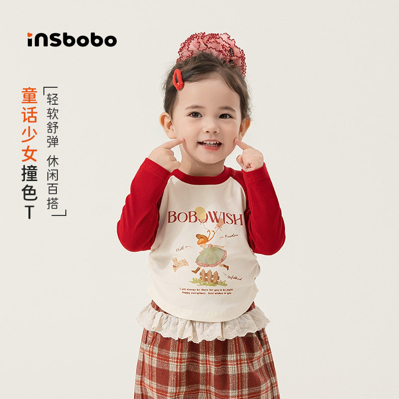 INSbobo女童上衣2026春季新款宝宝插肩袖红色春秋儿童长袖t恤童装