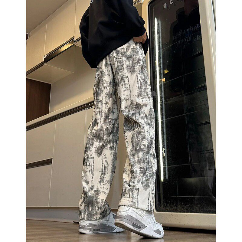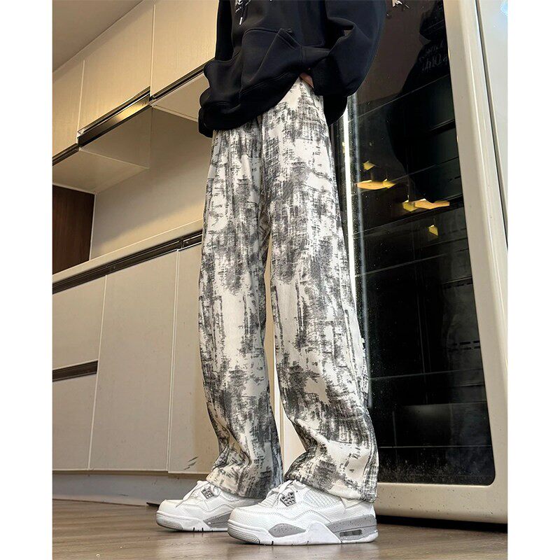 黑色扎染加绒卫裤男生秋冬季美式重磅灯芯绒裤子青少年直筒休闲裤