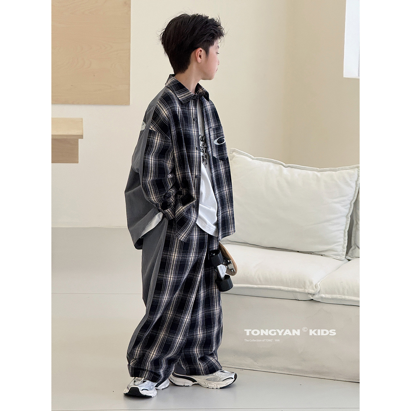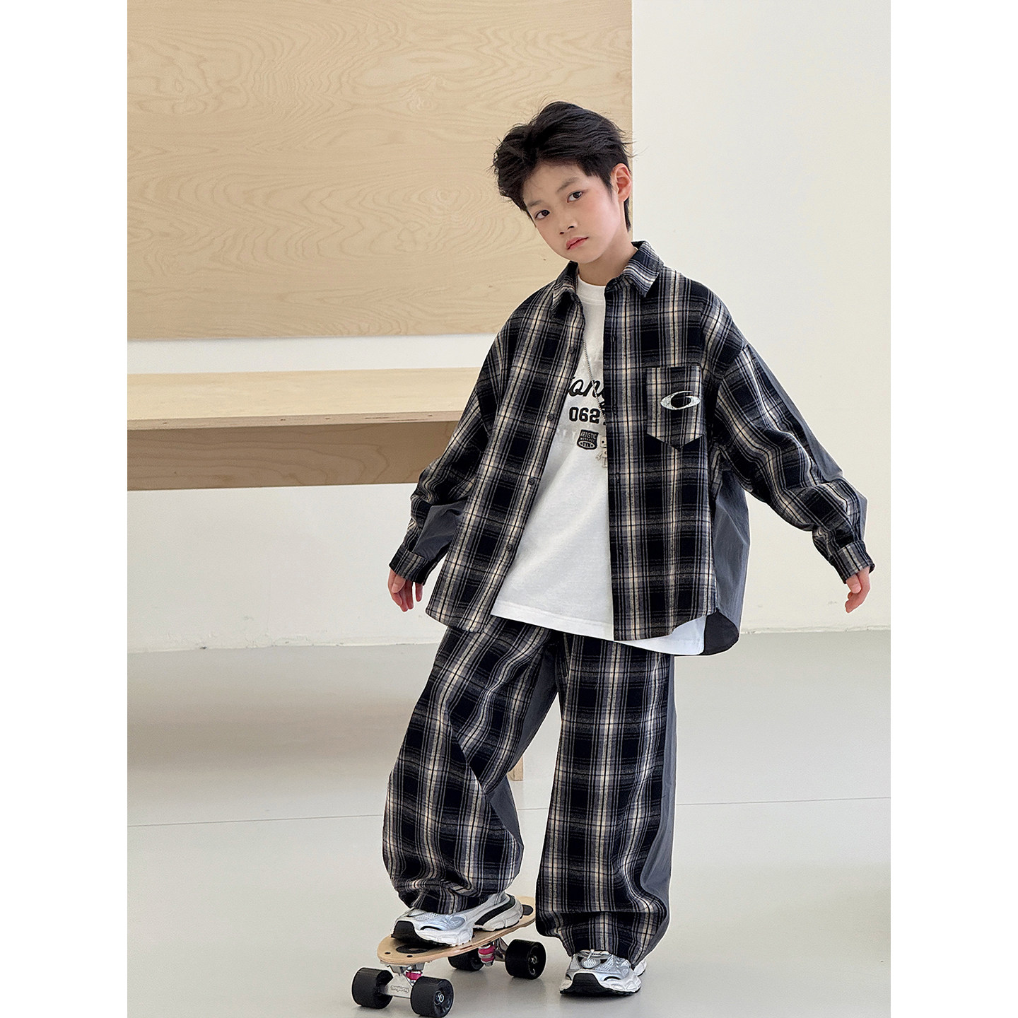 男童套装2026春装新款韩版中大童格子外套拼接长裤儿童运动两件套