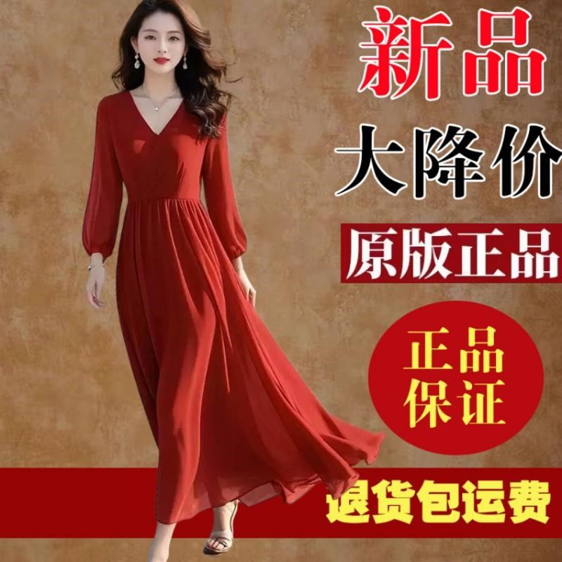 高档红色真丝雪纺连衣裙2025春秋长袖气质显瘦度假沙滩长款长裙女