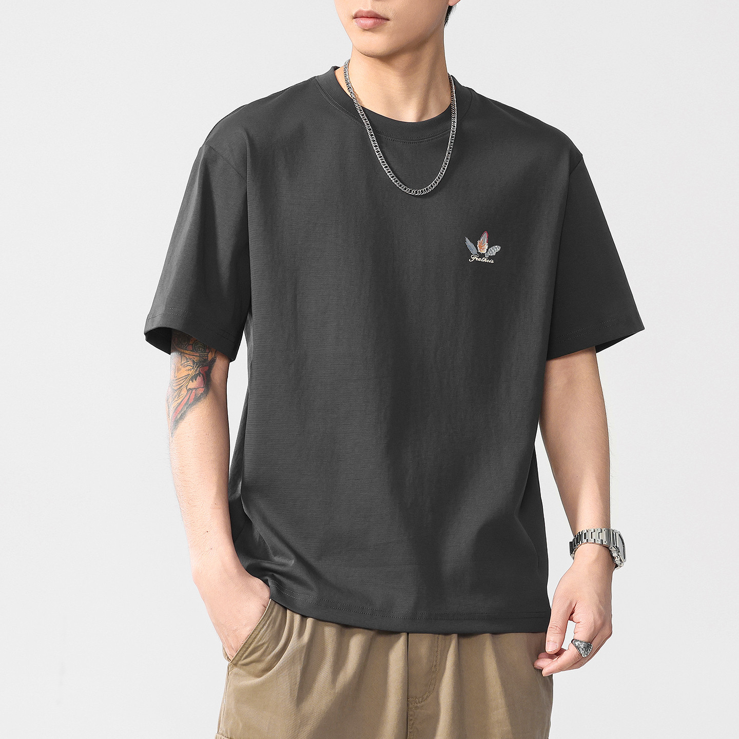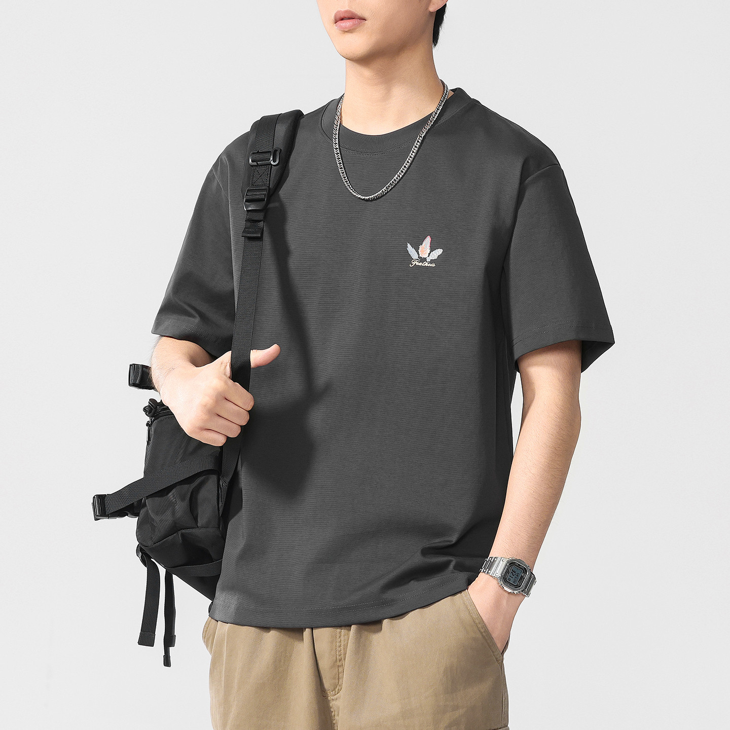 青少年灰色印花冰丝短袖T恤男款2026新款夏季宽松半袖设计感上衣