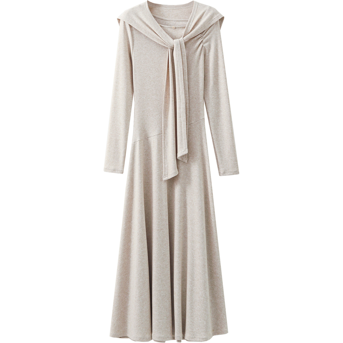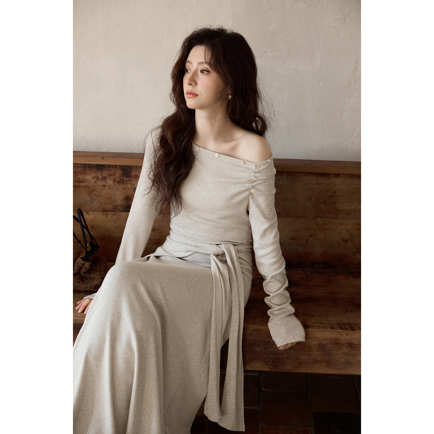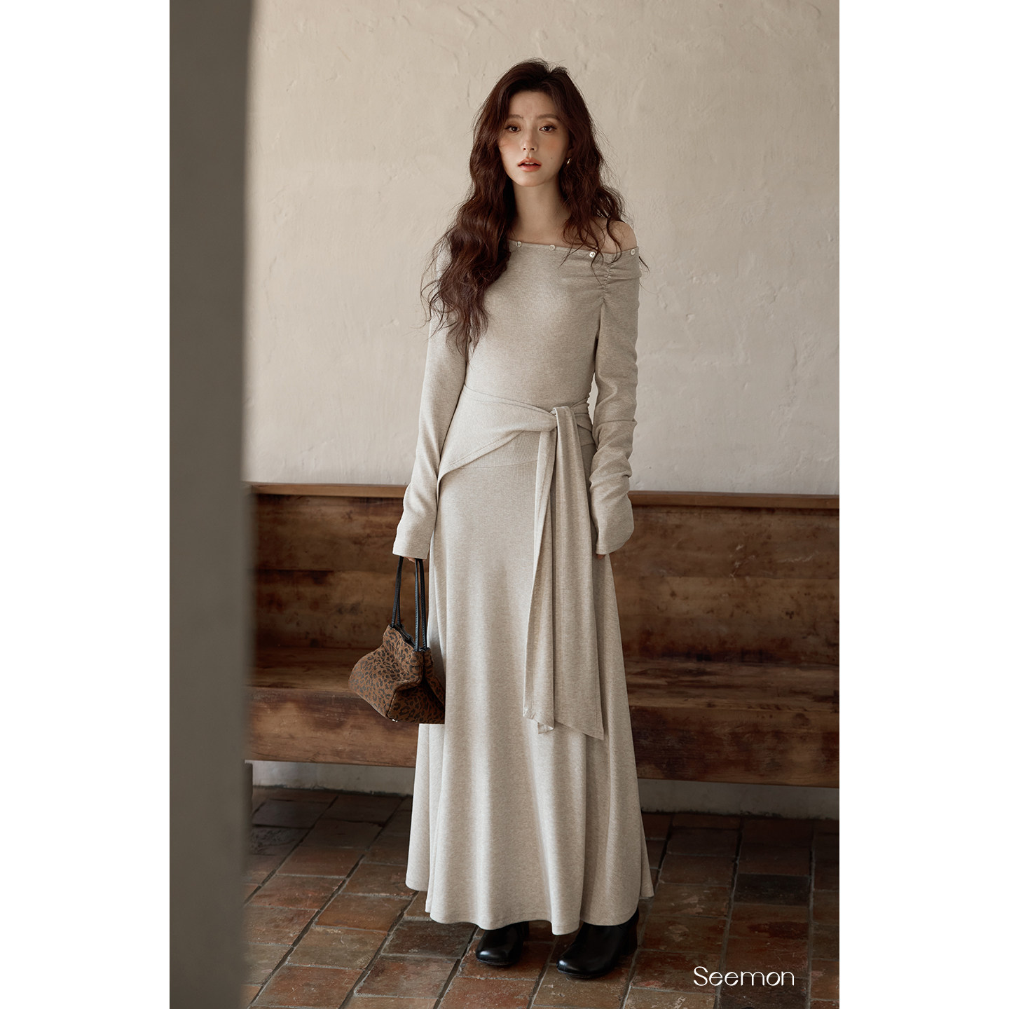 夕蒙2026新款春季韩系裙子高级感独特小个子巨好看斜肩长袖连衣裙