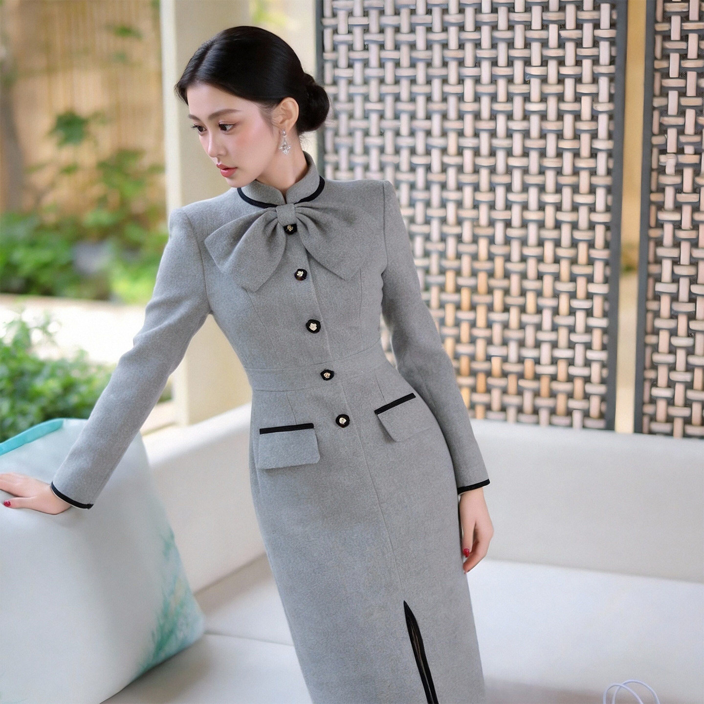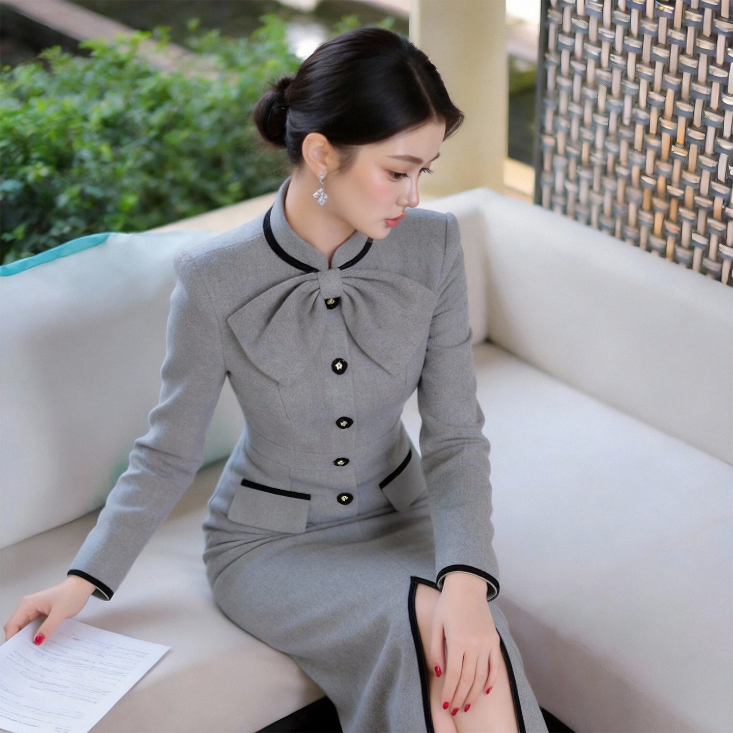 轻奢职场通勤显瘦高级感长袖连衣裙蝴蝶结气质名媛风修身包臀裙子