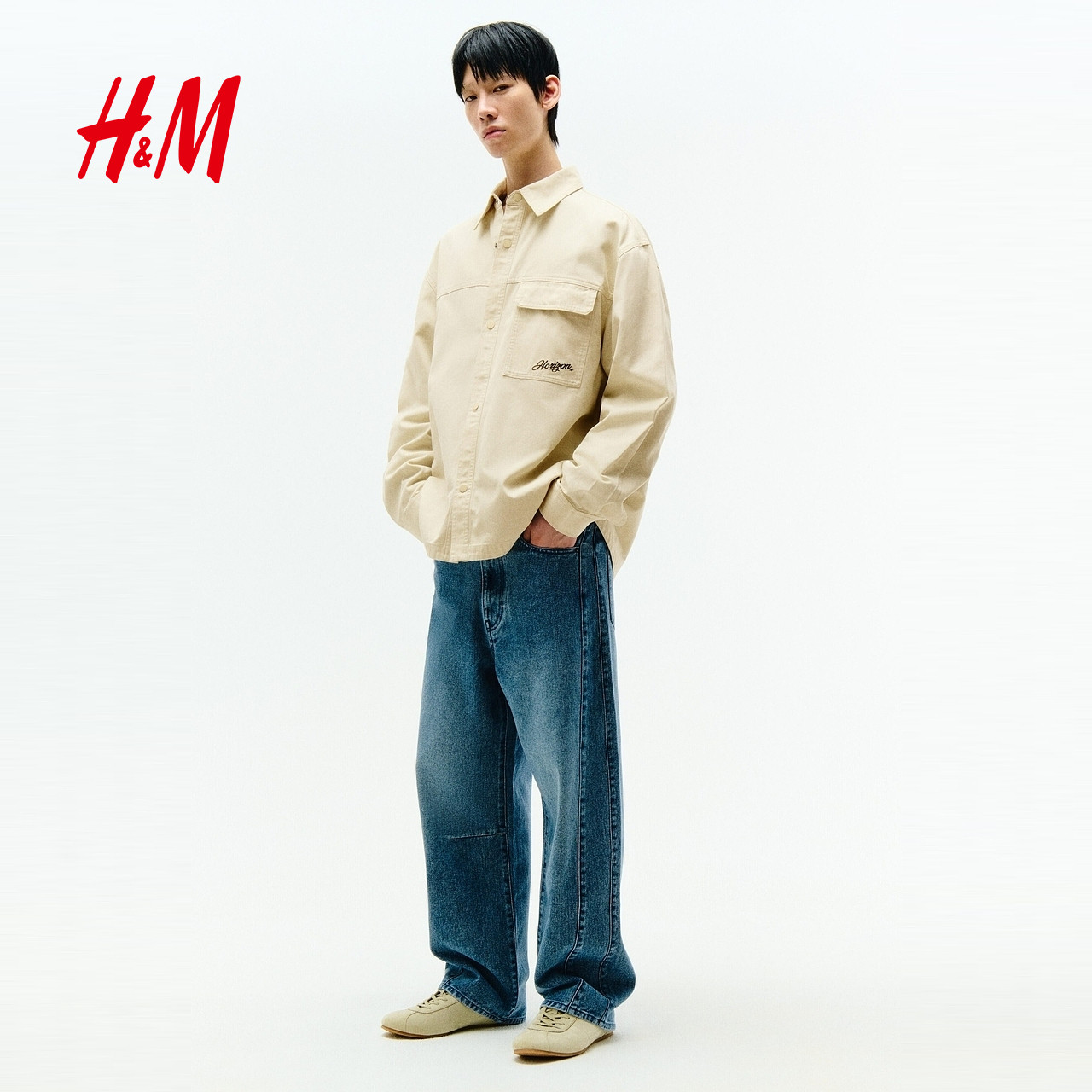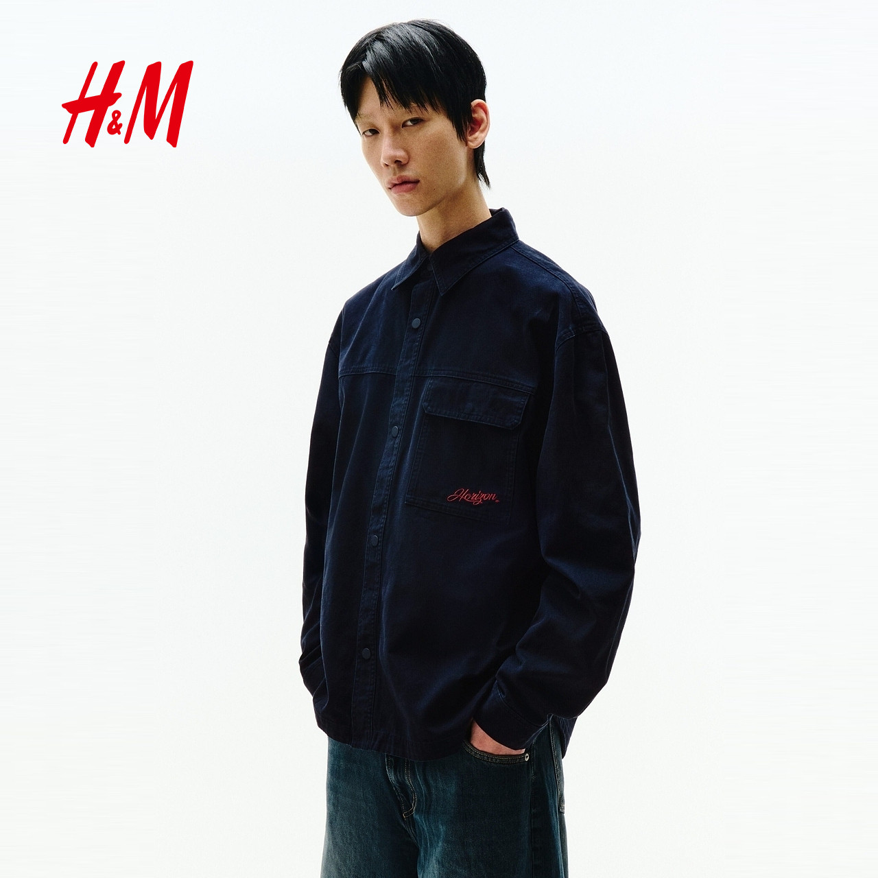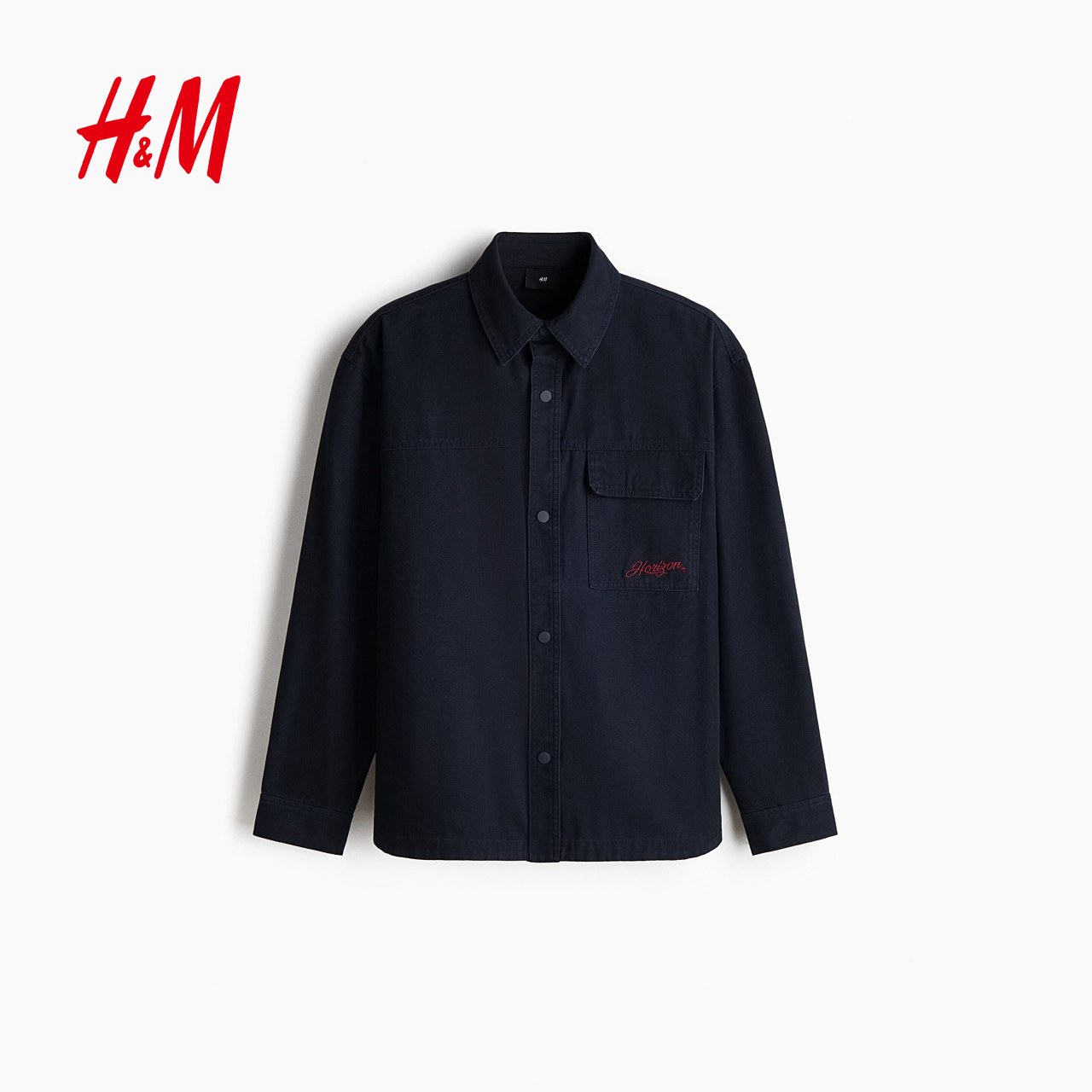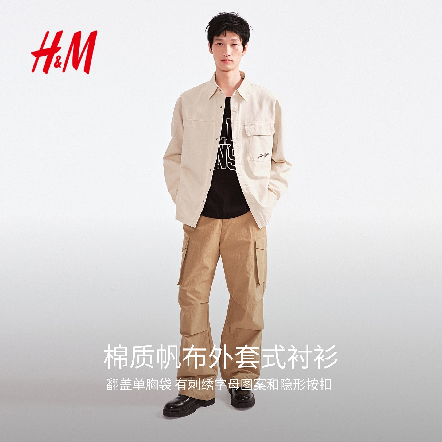 HM男装夹克2026春季新款翻领纽扣教练夹克帆布衬衫外套1307983