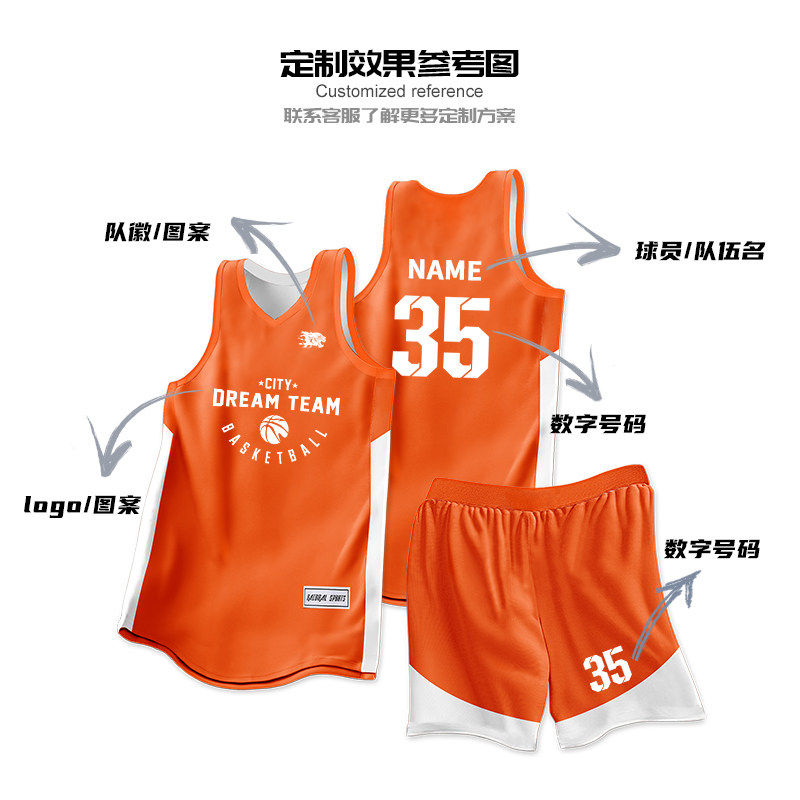 橙白美式双面篮球服套装定制男女队服比赛背心运动小学生儿童球衣