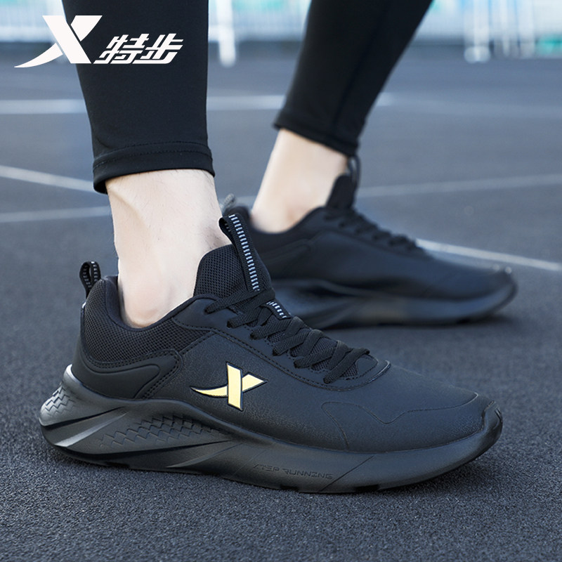 特步男鞋跑步鞋春季男款皮面防水休闲鞋子官方旗舰正品黑色运动鞋