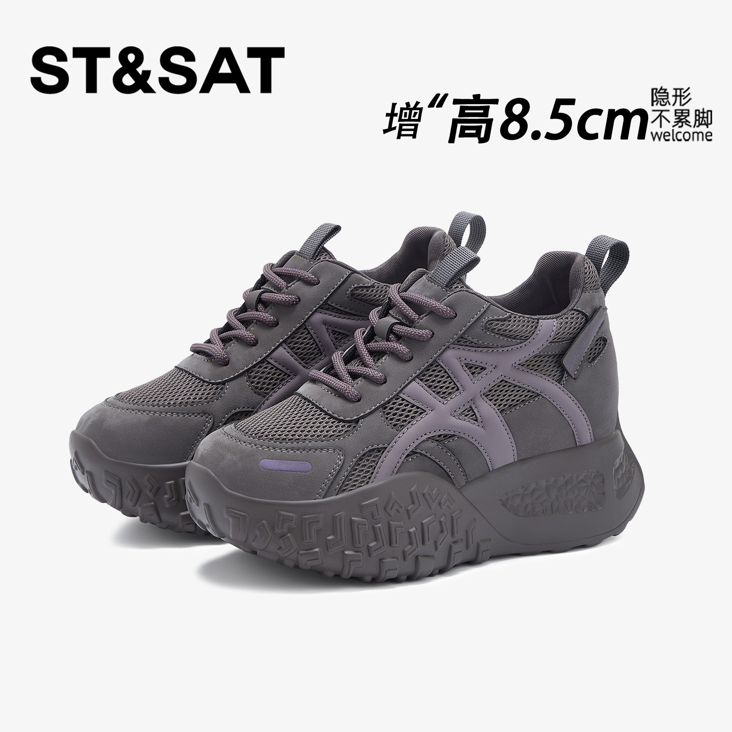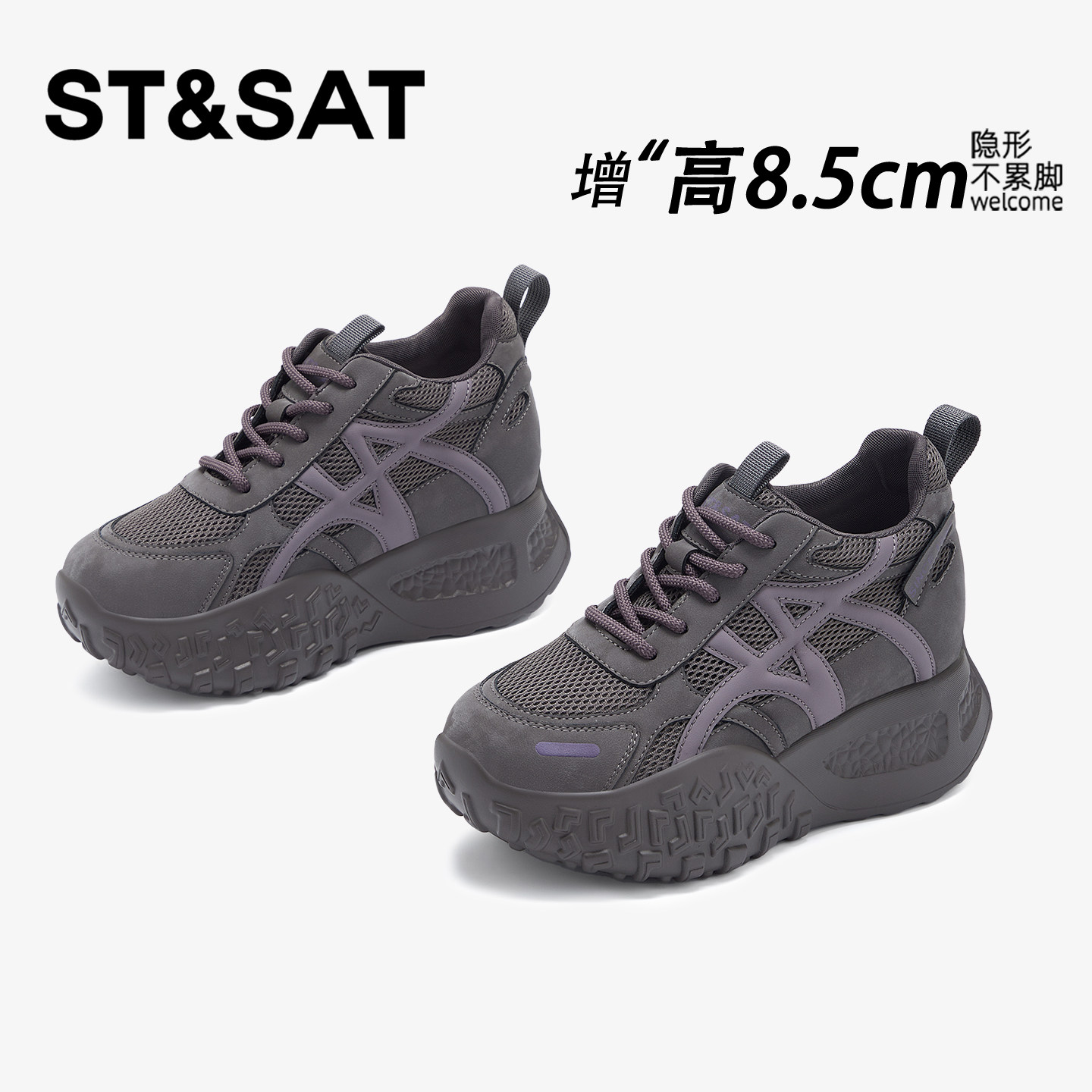 星期六8.5CM隐形内增高女鞋网面透气厚底小个子软底轻便老爹板鞋