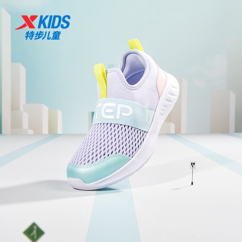 特步童鞋夏季新款女童网面透气跑步鞋中大童一脚蹬防滑儿童运动鞋