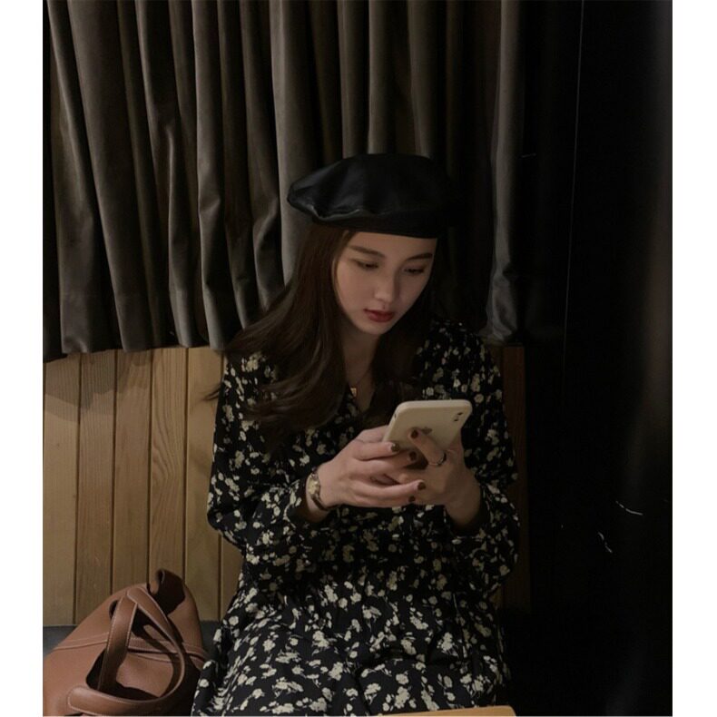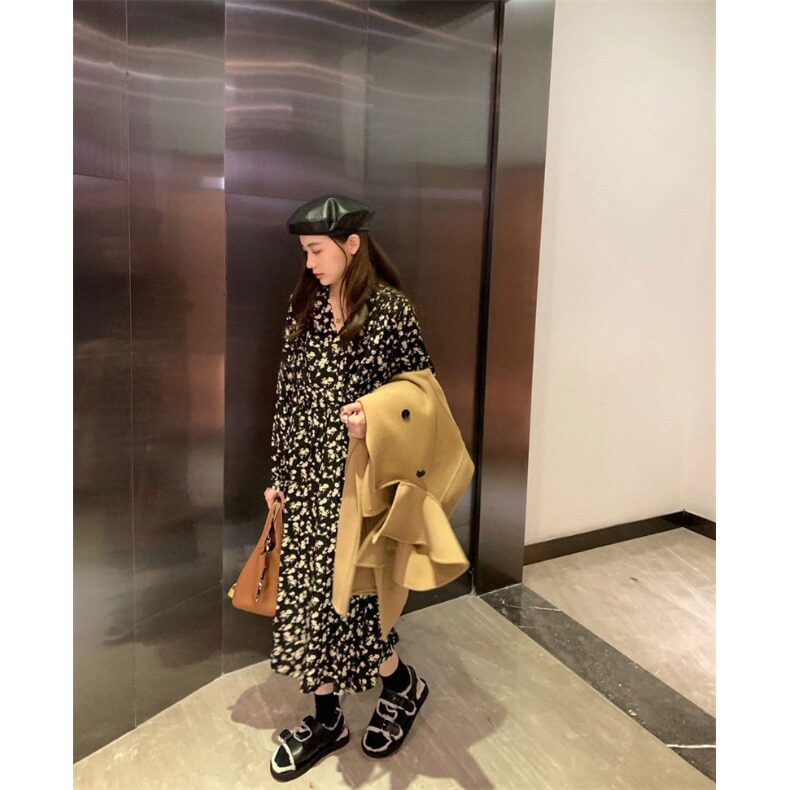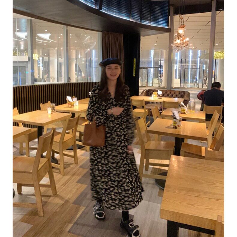 小个子法式复古碎花v领系带连衣裙女150cm气质收腰长袖长裙xs码春