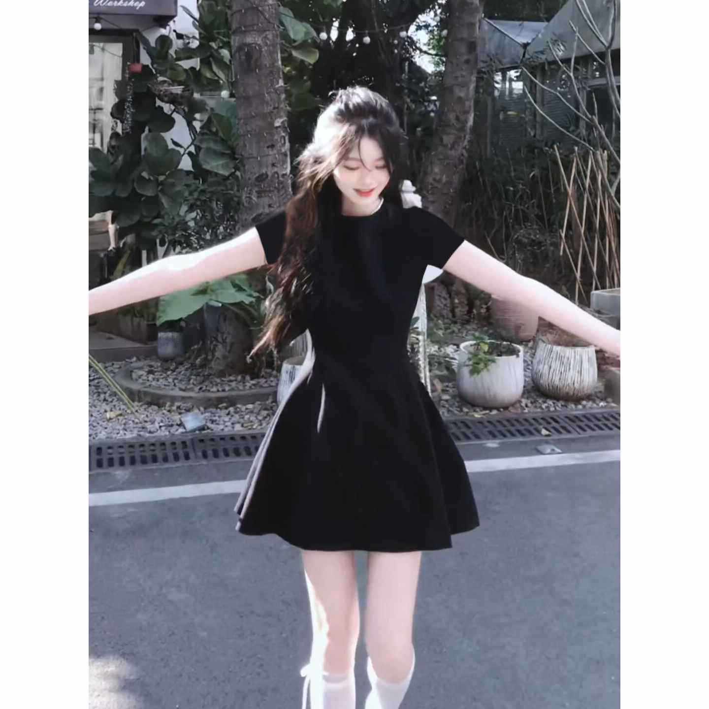 黑色正肩有袖连衣裙短款女夏日绝美赫本风小黑裙子收腰a字掐腰裙