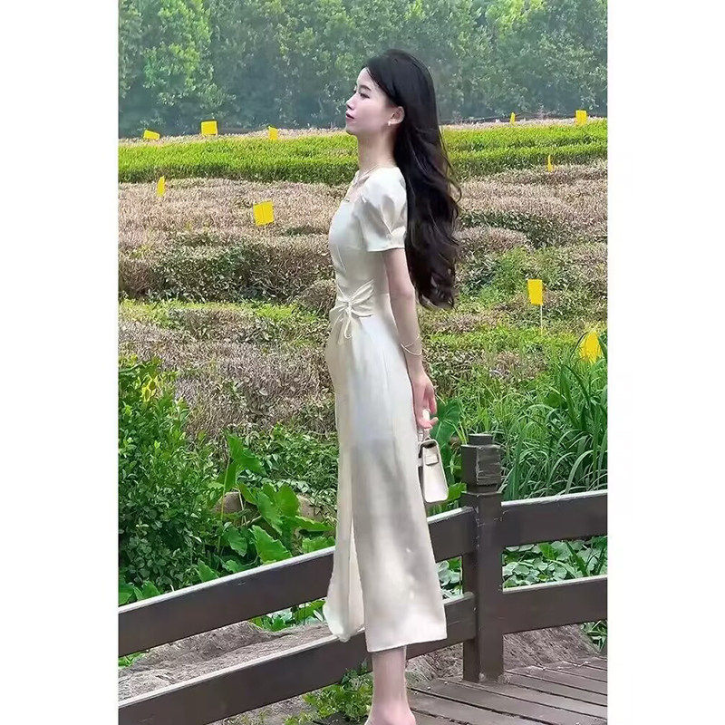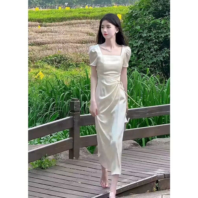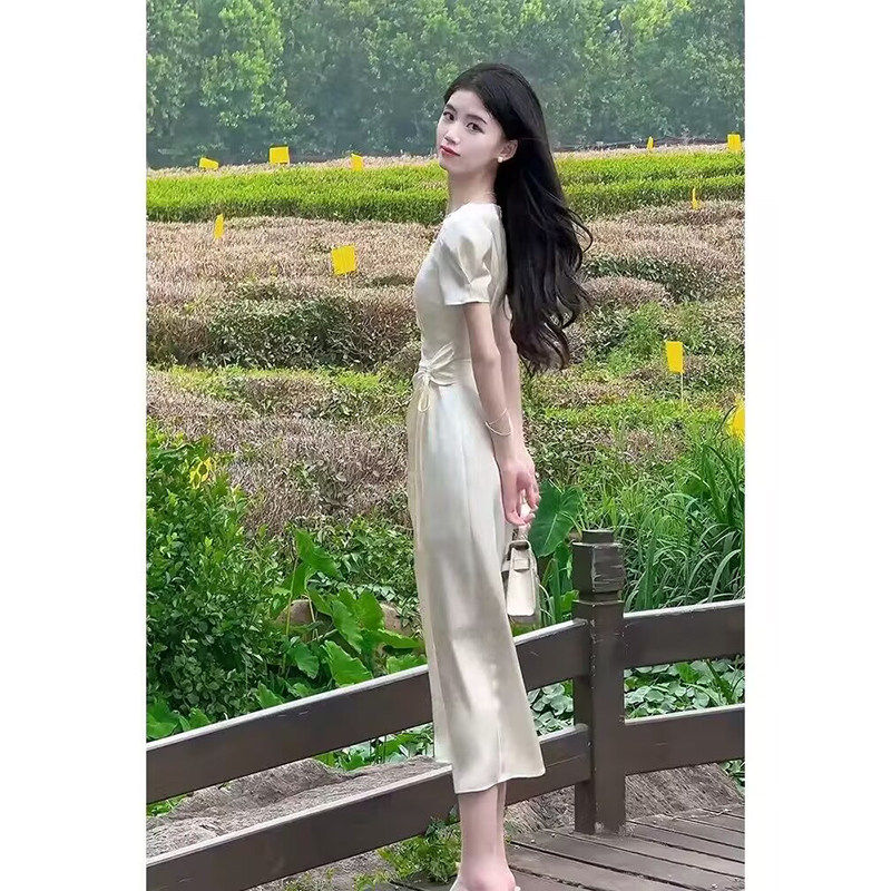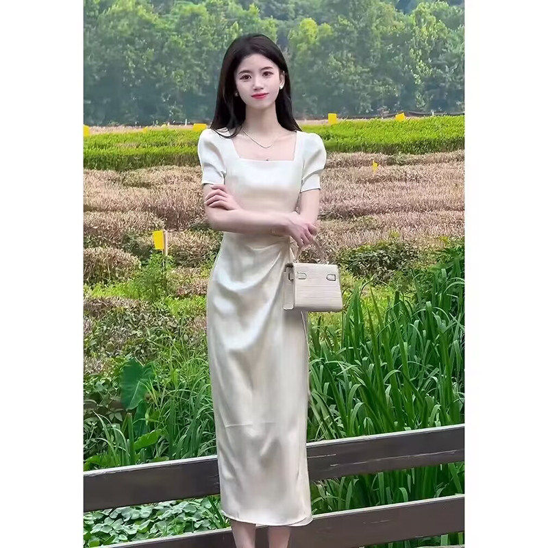 缎面连衣裙子女士装夏季2026年新款法式气质名媛高级感短袖中长裙