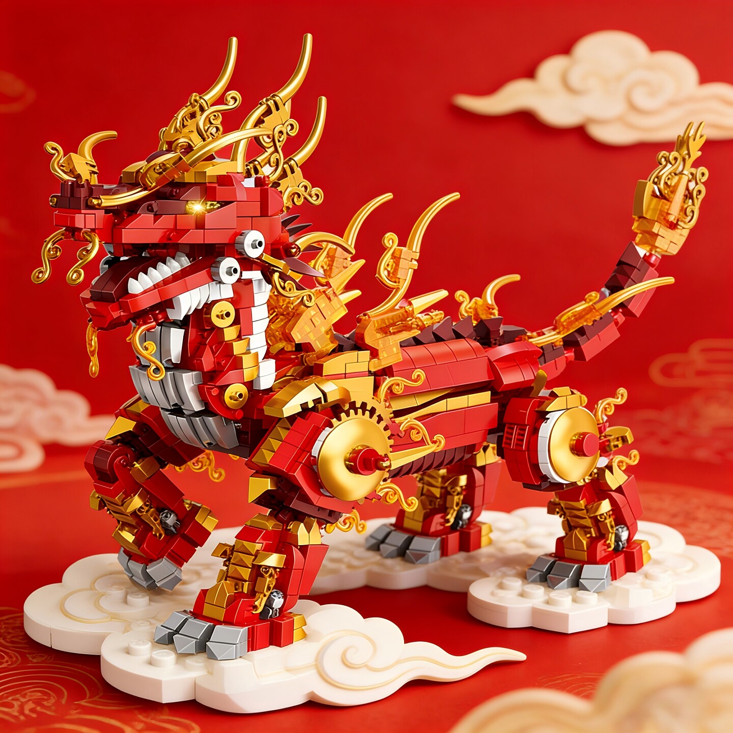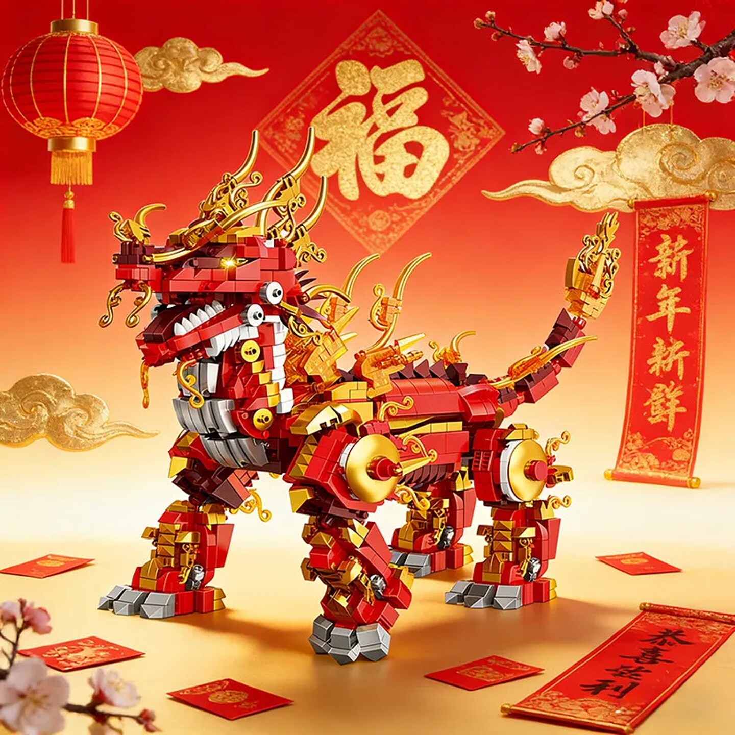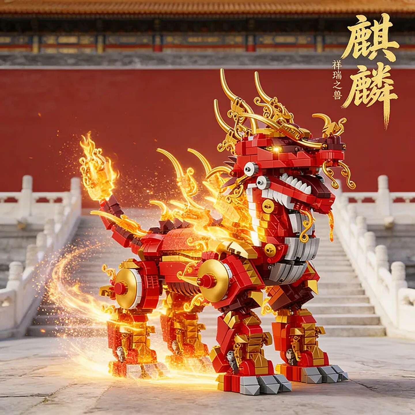 国朝瑞兽麒麟拼装益智玩具积木马年吉祥物模型男孩新年礼物6-12岁