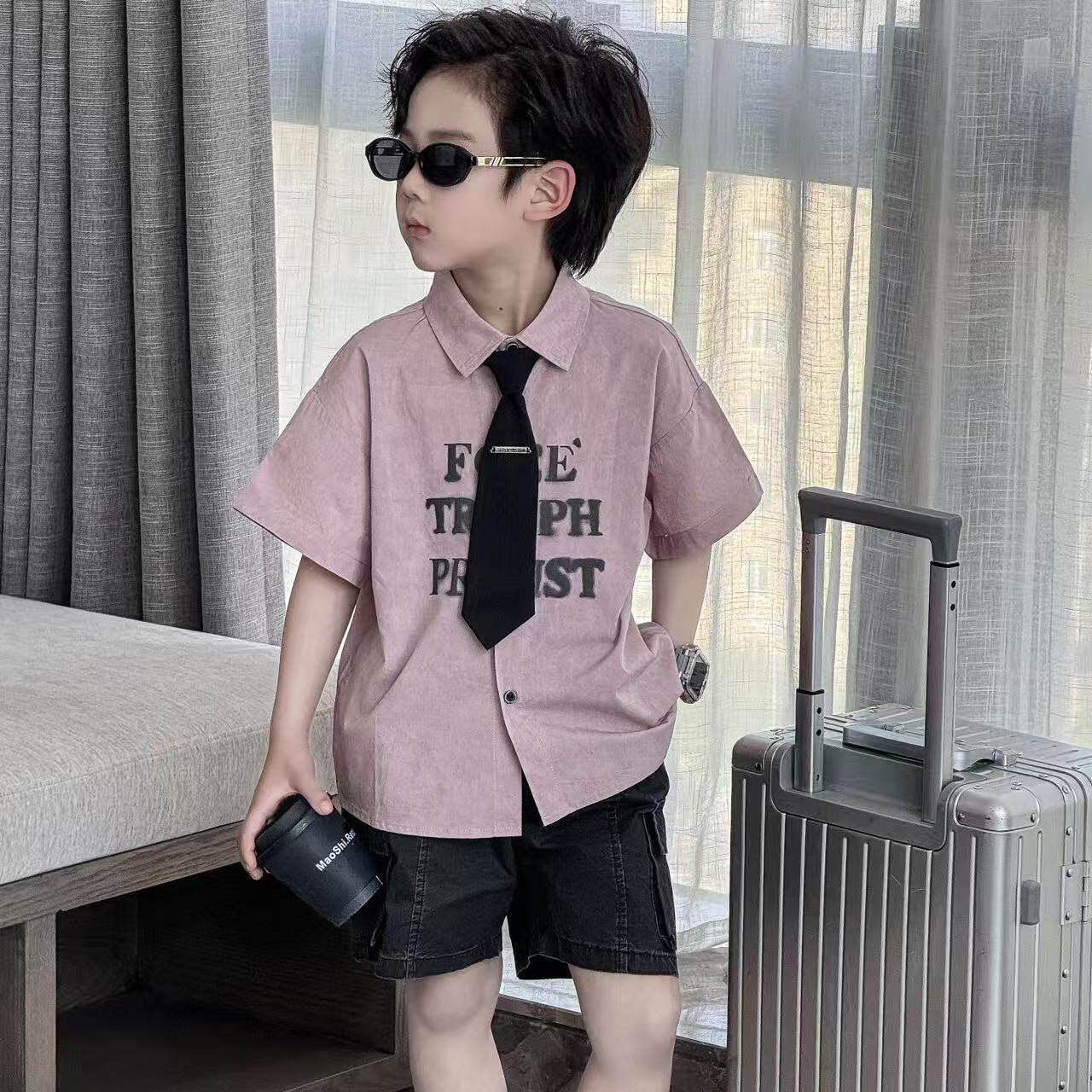 男童学院风领带衬衫2026潮牌中大童装夏季新款帅气短袖儿童衬衣