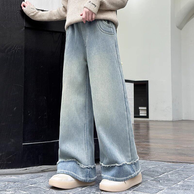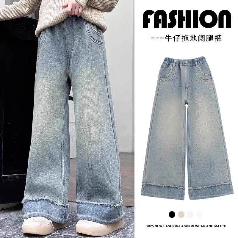 女童牛仔裤2026新款秋冬季加绒中大童阔腿裤加厚羊驼绒儿童直筒裤