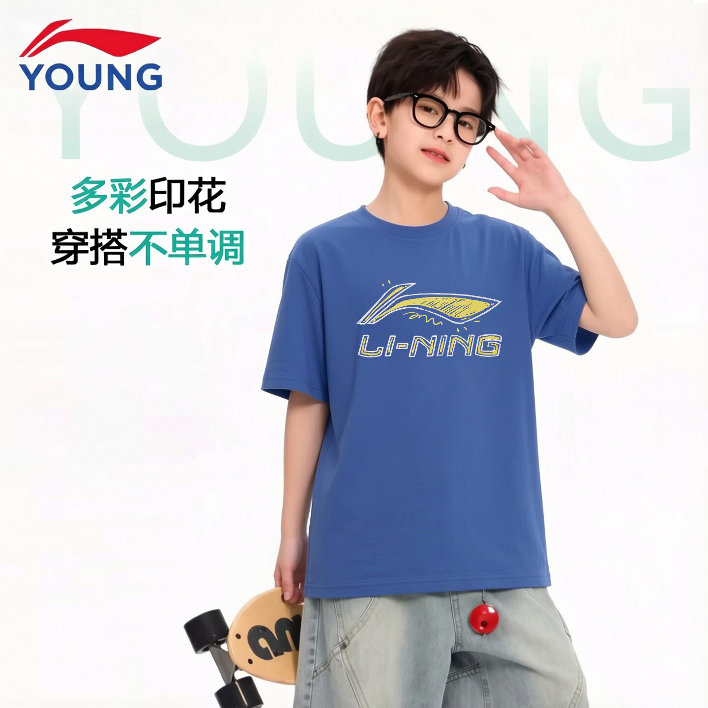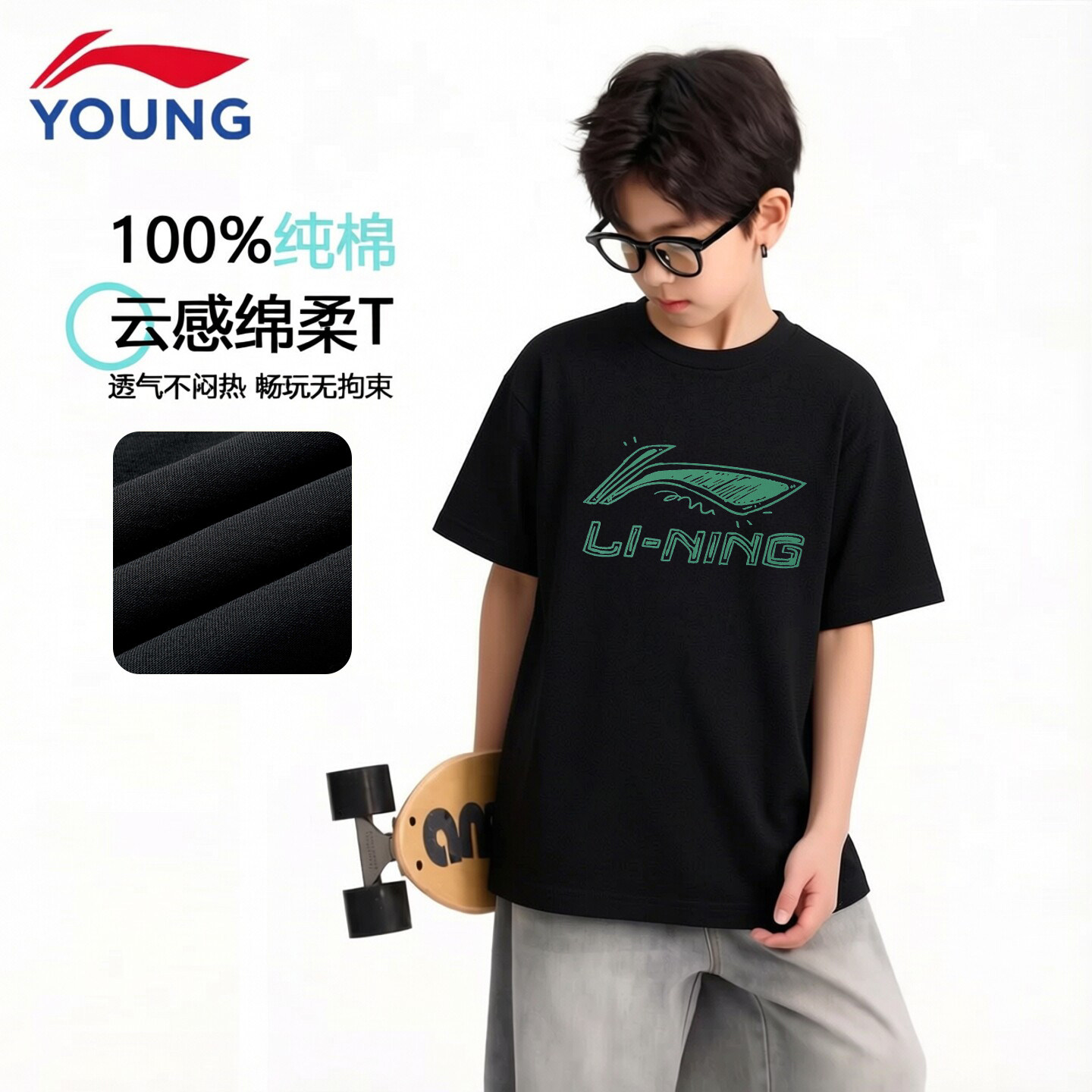 李宁儿童短袖男大童2026夏季新款青少年纯棉舒适透气印花运动T恤