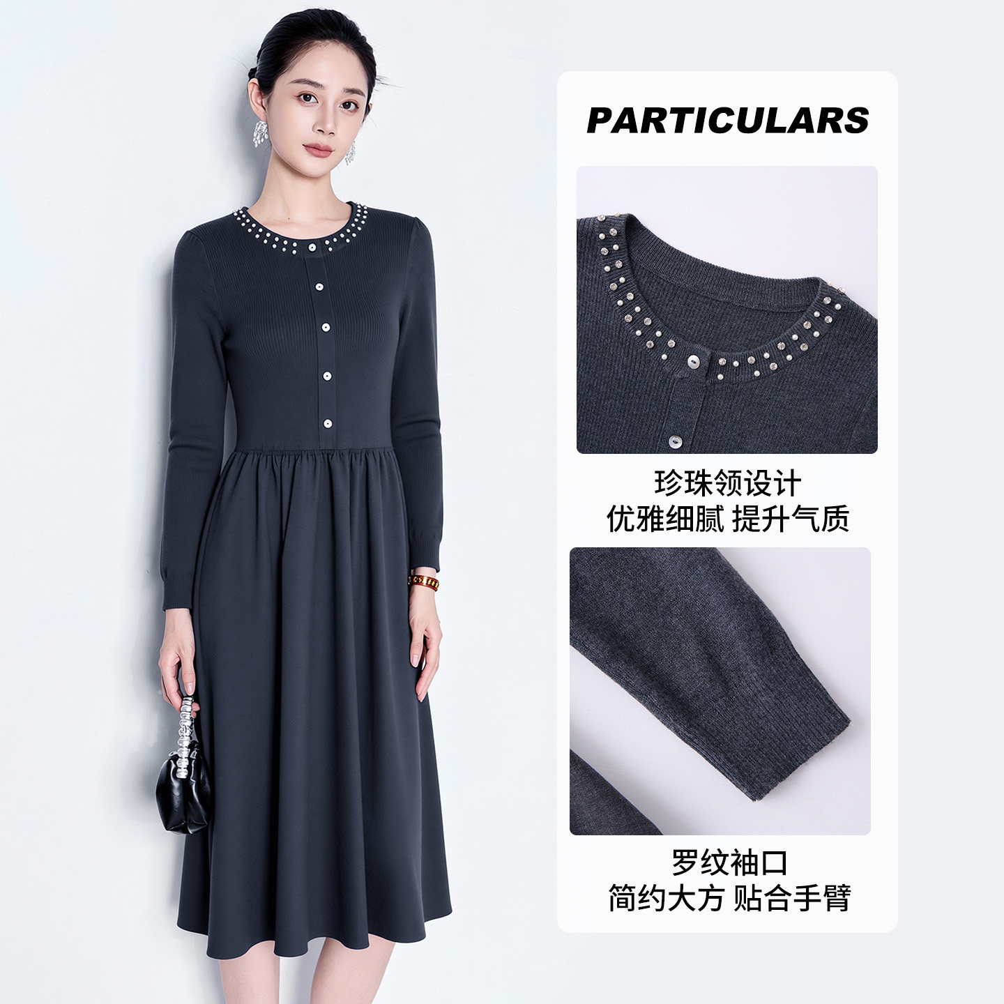 311线报网描述:钉珠圆领设计 收腰显瘦版型 时尚优雅风格